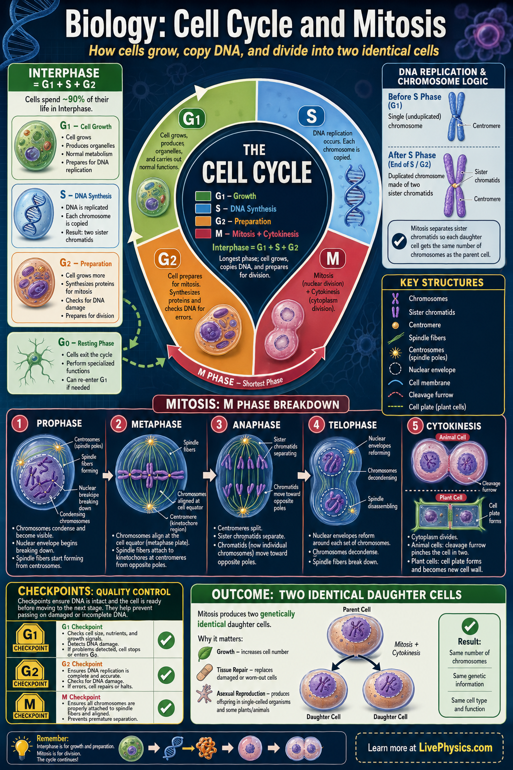 Mitosis itself has four stages: prophase, metaphase, anaphase, and telophase. Chromosomes condense and become visible in prophase, align at the cell equator in metaphase, are pulled to opposite poles in anaphase, and decondense as new nuclei form in telophase. Cytokinesis then splits the cytoplasm to produce two genetically identical daughter cells. Cell cycle checkpoints at G1, G2, and the spindle assembly checkpoint ensure accuracy — errors at these points can lead to cancer.