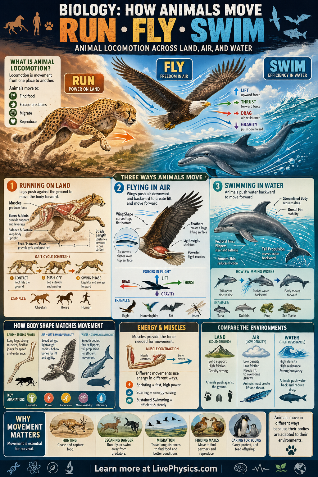 Animals move in different ways because they live in different environments and have body structures adapted to those environments. Running, flying, and swimming all require forces that push against the ground, air, or water. Muscles provide the energy, while bones, wings, fins, and body shape help turn that energy into motion. Studying animal movement helps explain survival, hunting, migration, and escape from predators.
