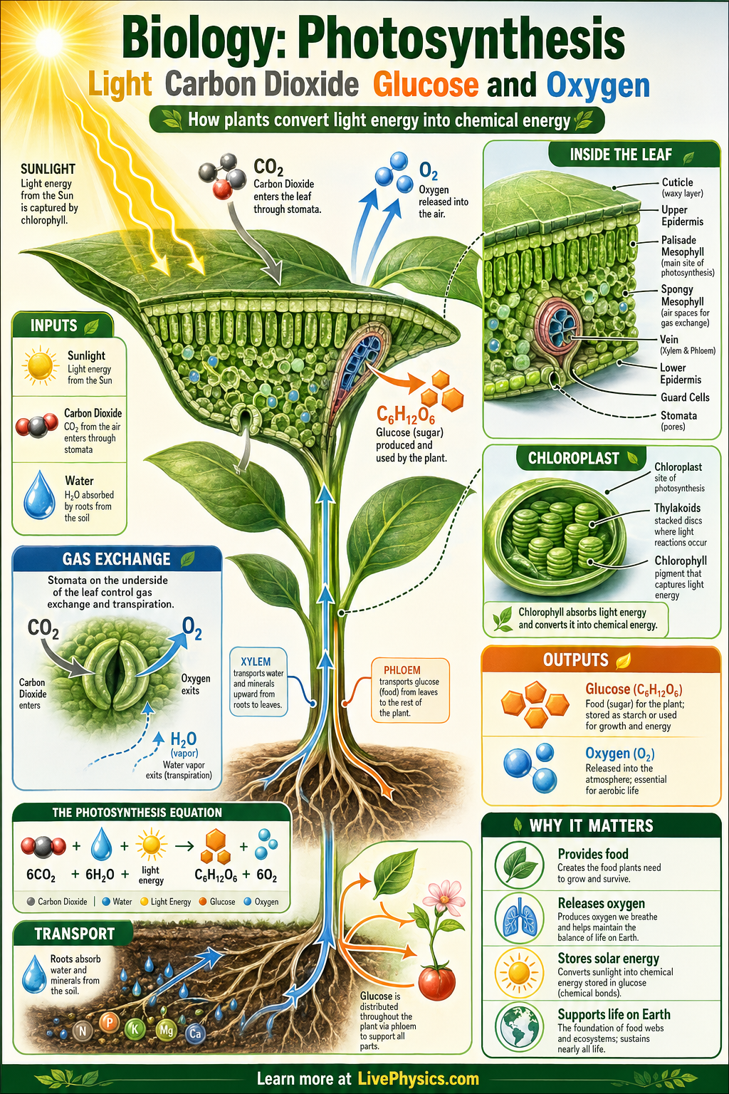 Photosynthesis is the process plants use to capture light energy and store it as chemical energy in glucose. It is one of the most important reactions on Earth because it provides food for plants and releases oxygen into the atmosphere. This process supports food webs, helps regulate carbon dioxide levels, and makes life possible for many organisms. Understanding photosynthesis connects biology, chemistry, and environmental science.