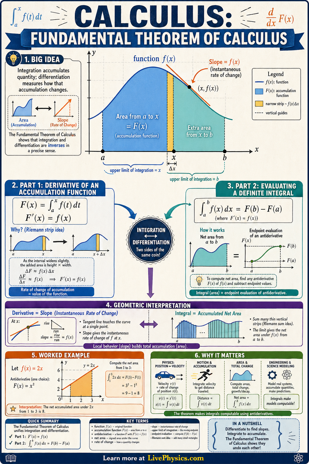 The Fundamental Theorem of Calculus is one of the most important ideas in mathematics because it shows that differentiation and integration are inverse processes. Differentiation measures instantaneous change, while integration measures accumulated quantity such as area under a curve. This theorem lets students move between rates and totals in a precise way. It is the bridge that makes much of applied calculus possible in physics, engineering, economics, and biology.