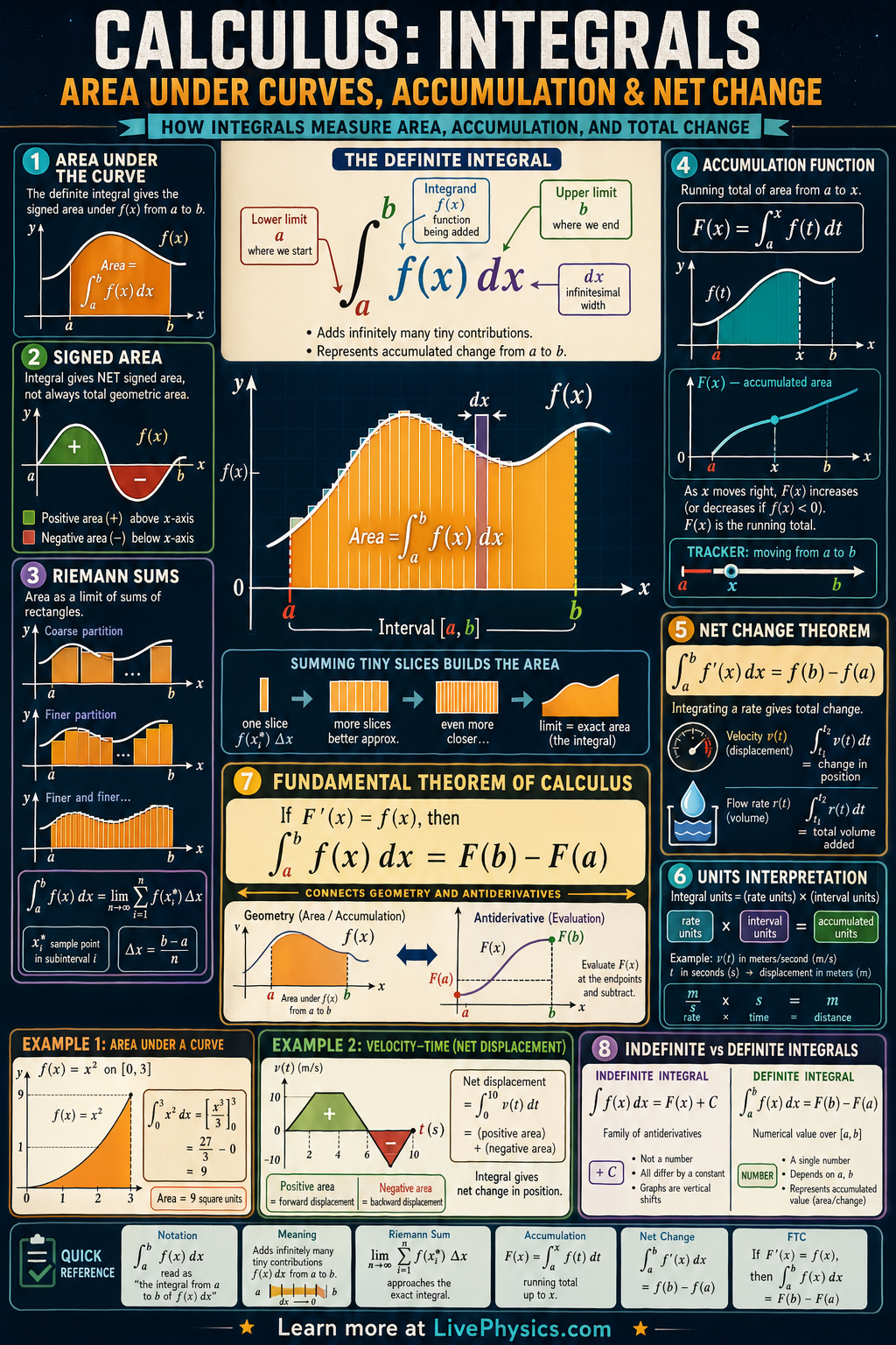 Integrals are a central idea in calculus because they measure how quantities build up over an interval. Geometrically, a definite integral gives the signed area between a curve and the x-axis. This lets students connect graphs, formulas, and real physical meaning. Integrals are used in physics, economics, biology, and engineering whenever change accumulates over time or space.