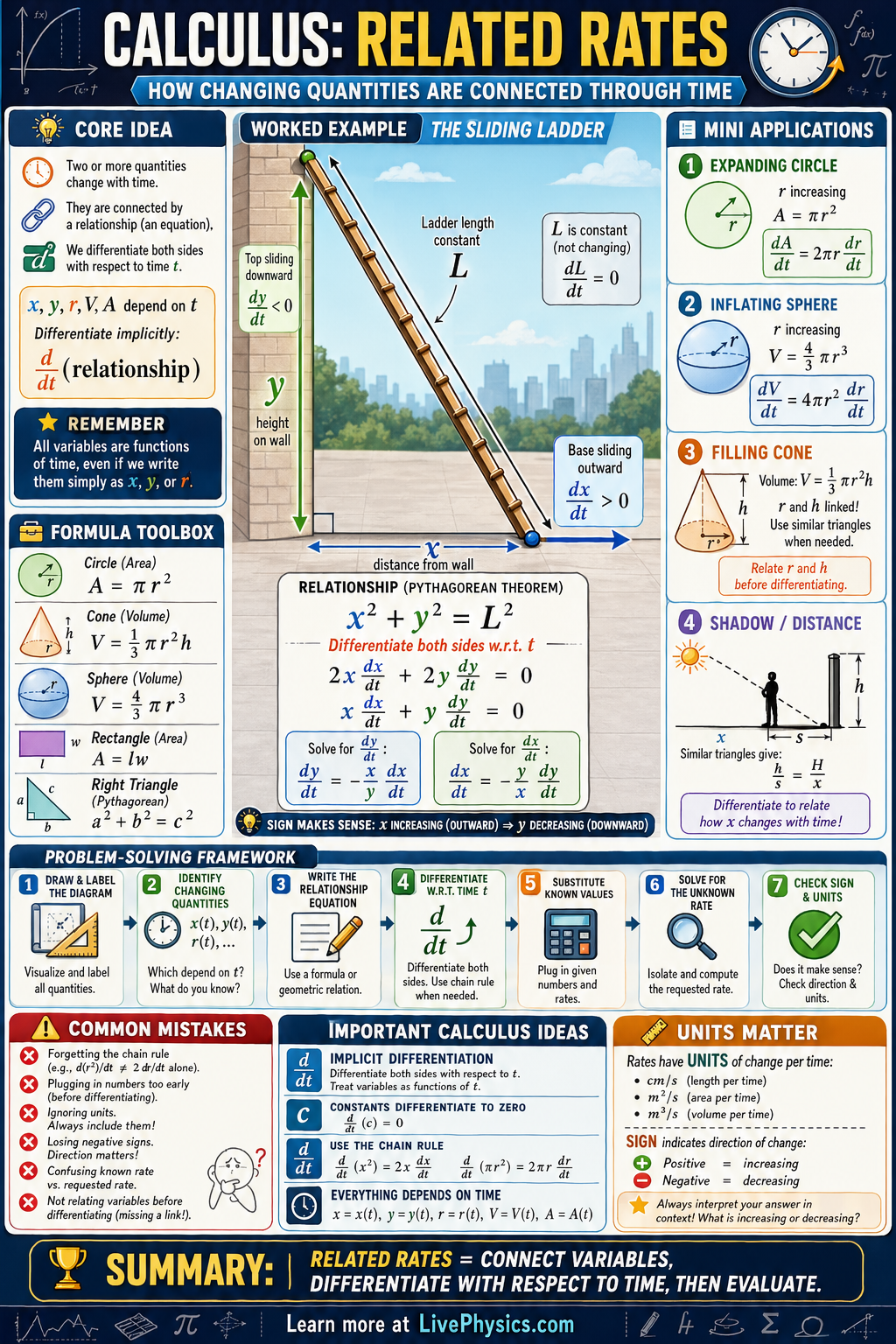 Related rates is a calculus topic about quantities that change with time and are linked by an equation. Instead of finding how one variable changes by itself, you use a relationship between variables to connect their rates of change. This matters because many real situations involve several changing measurements at once, such as ladders sliding, balloons expanding, or shadows moving. The goal is usually to find one rate like dx/dt or dy/dt when another rate is known.