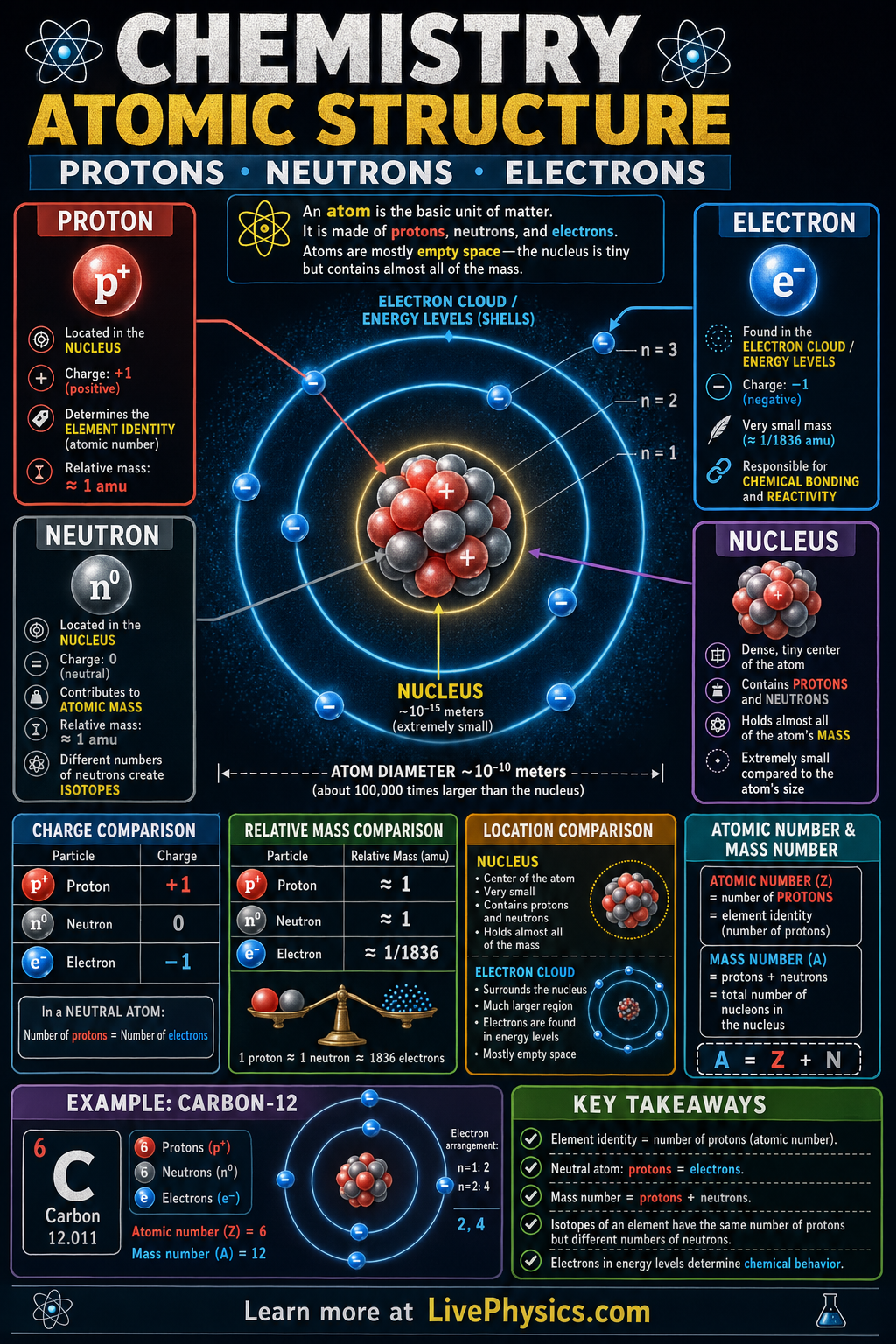 Atomic structure explains how all matter is built from a small set of subatomic particles. Every atom contains protons, neutrons, and electrons arranged in a specific way. This structure determines an element's identity, mass, and chemical behavior. Understanding atomic structure is the foundation for chemistry, electricity, bonding, and nuclear science.
