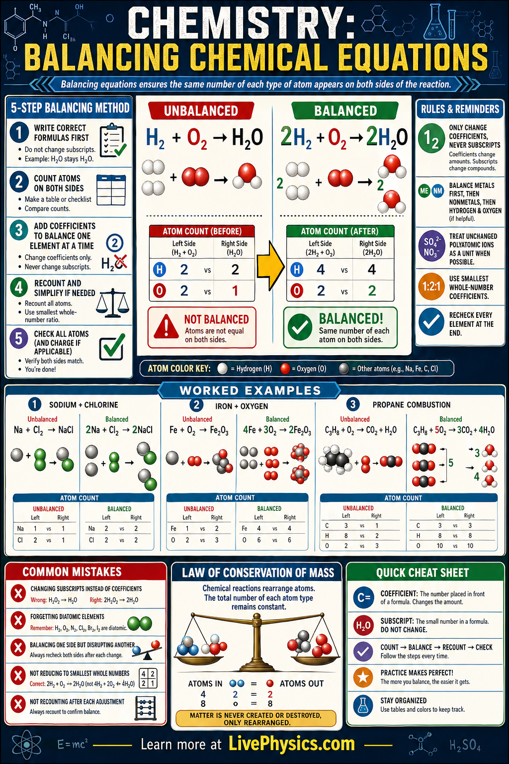 - Law of conservation of mass: total atoms of each element must be equal on both sides of the equation.