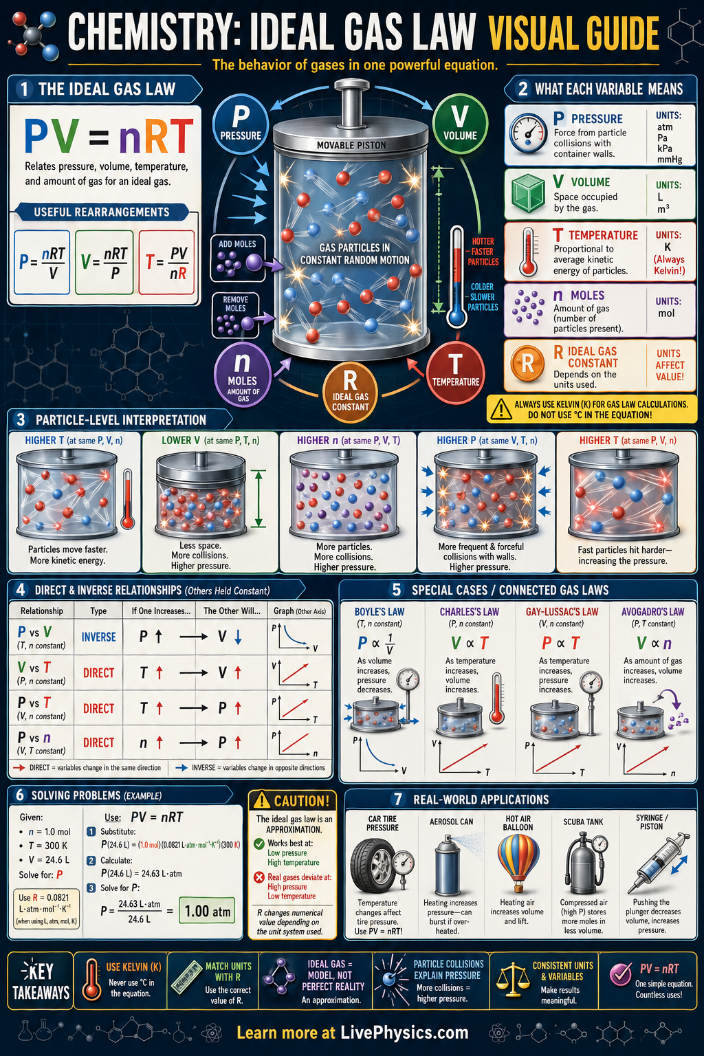 The ideal gas law, PV = nRT, combines three simpler gas laws into a single equation relating pressure (P), volume (V), amount of gas in moles (n), and temperature in kelvin (T). R is the universal gas constant (8.314 J/mol·K or 0.08206 L·atm/mol·K). The law assumes gas molecules have no volume and no intermolecular forces — assumptions that hold well at low pressure and high temperature.