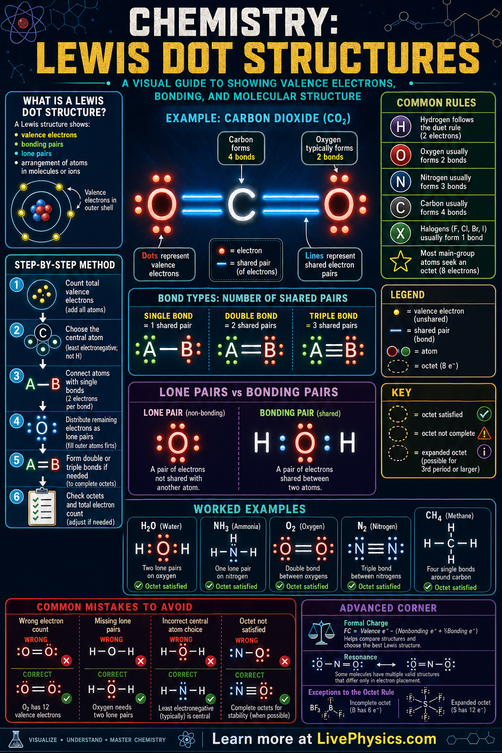 - Forgetting to count the total valence electrons first, which leads to structures with too many or too few electrons. Always add electrons from every atom before drawing bonds.