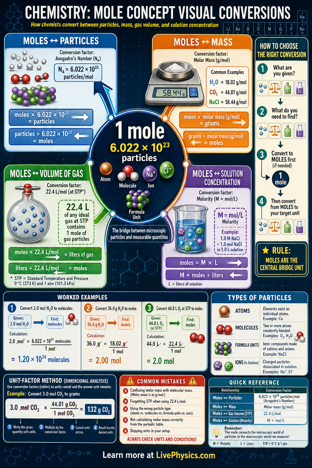 The mole is a counting unit in chemistry that connects the tiny world of atoms and molecules to measurable amounts in the lab. One mole always contains 6.022 x 10^23 particles, a number called Avogadro's number. This idea lets chemists convert between particles, mass, volume of gases, and chemical equations. Learning mole conversions is essential for solving problems in stoichiometry, reactions, and solution chemistry.