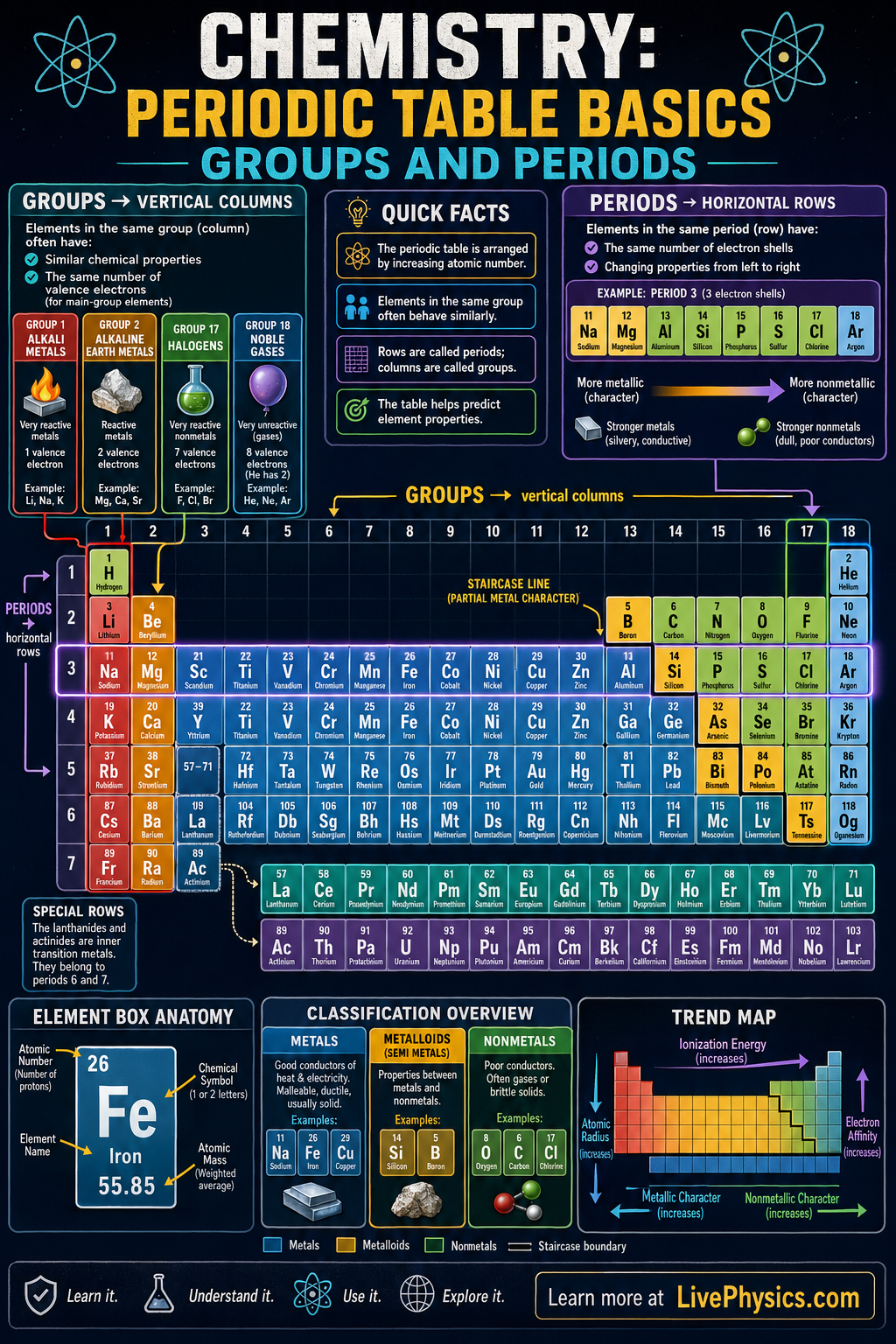 The periodic table is a map of all known elements, arranged so that patterns in their properties become easy to see. Its two main organizing features are groups, which run vertically, and periods, which run horizontally. Learning groups and periods helps students predict how elements behave in reactions, what kinds of ions they form, and how their atoms are structured. This organization is one of the most powerful tools in chemistry because it connects atomic structure to chemical behavior.