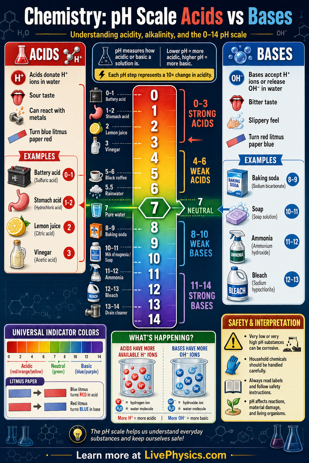 - Mixing up acids and bases by memorizing the scale backward, which is wrong because low pH means more H+ and high pH means less H+.