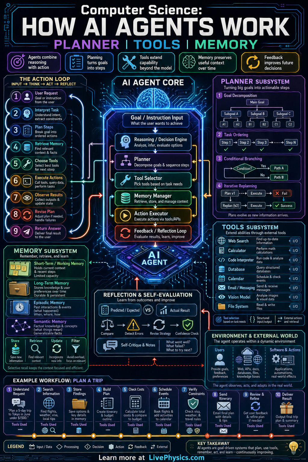 A typical AI agent starts with an input goal, builds a plan, chooses tools, performs actions, reads feedback, and revises its next step. Memory helps the agent keep track of past interactions, important facts, and intermediate results across the task. Reasoning helps it compare options and detect errors, while the action loop lets it continue until it reaches a stopping condition such as success, timeout, or human approval.
