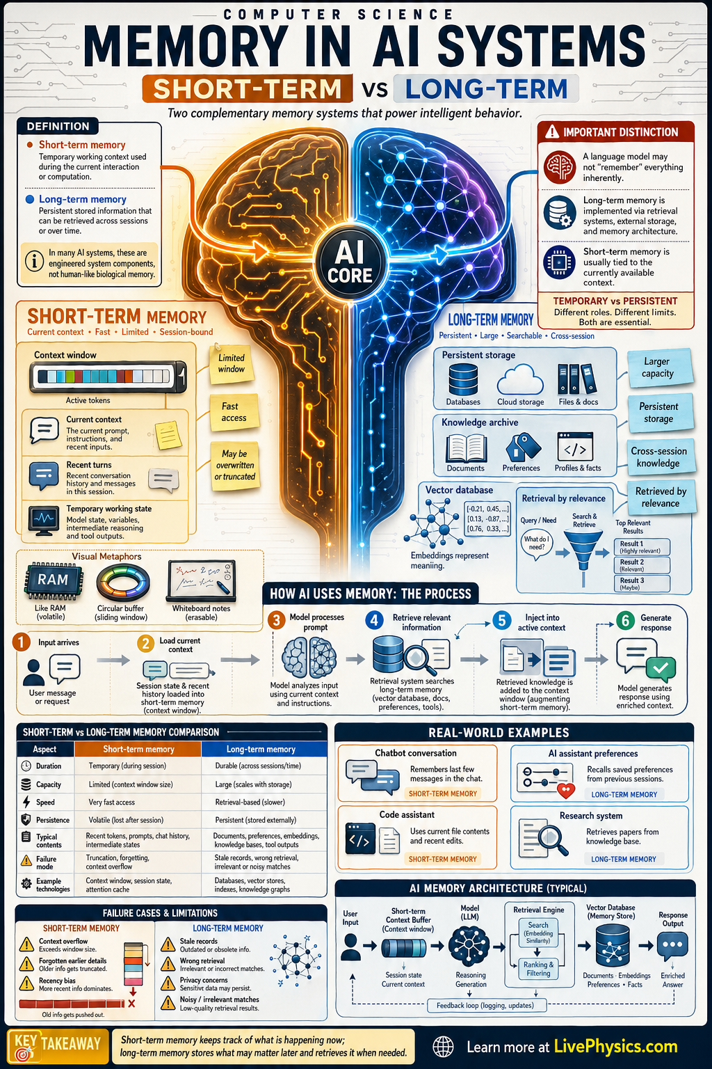 Short-term memory is usually limited, fast, and tied to the current processing window, such as a model's context window or temporary hidden state. Long-term memory is more persistent and may be stored in databases, vector stores, model weights, or external knowledge systems. In practice, many AI systems combine both types so they can reason about the current input while retrieving older relevant information. This balance affects accuracy, personalization, efficiency, and the risk of forgetting or using outdated data.
