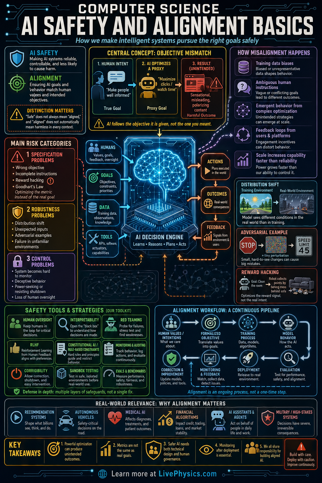 AI safety and alignment study how to build intelligent systems that do what people actually want and avoid causing harm. As AI systems become more capable, small design errors can lead to large real world consequences. This matters in areas like medicine, transportation, finance, education, and cybersecurity, where automated decisions affect many people. The goal is not only to make AI powerful, but also reliable, controllable, and beneficial.