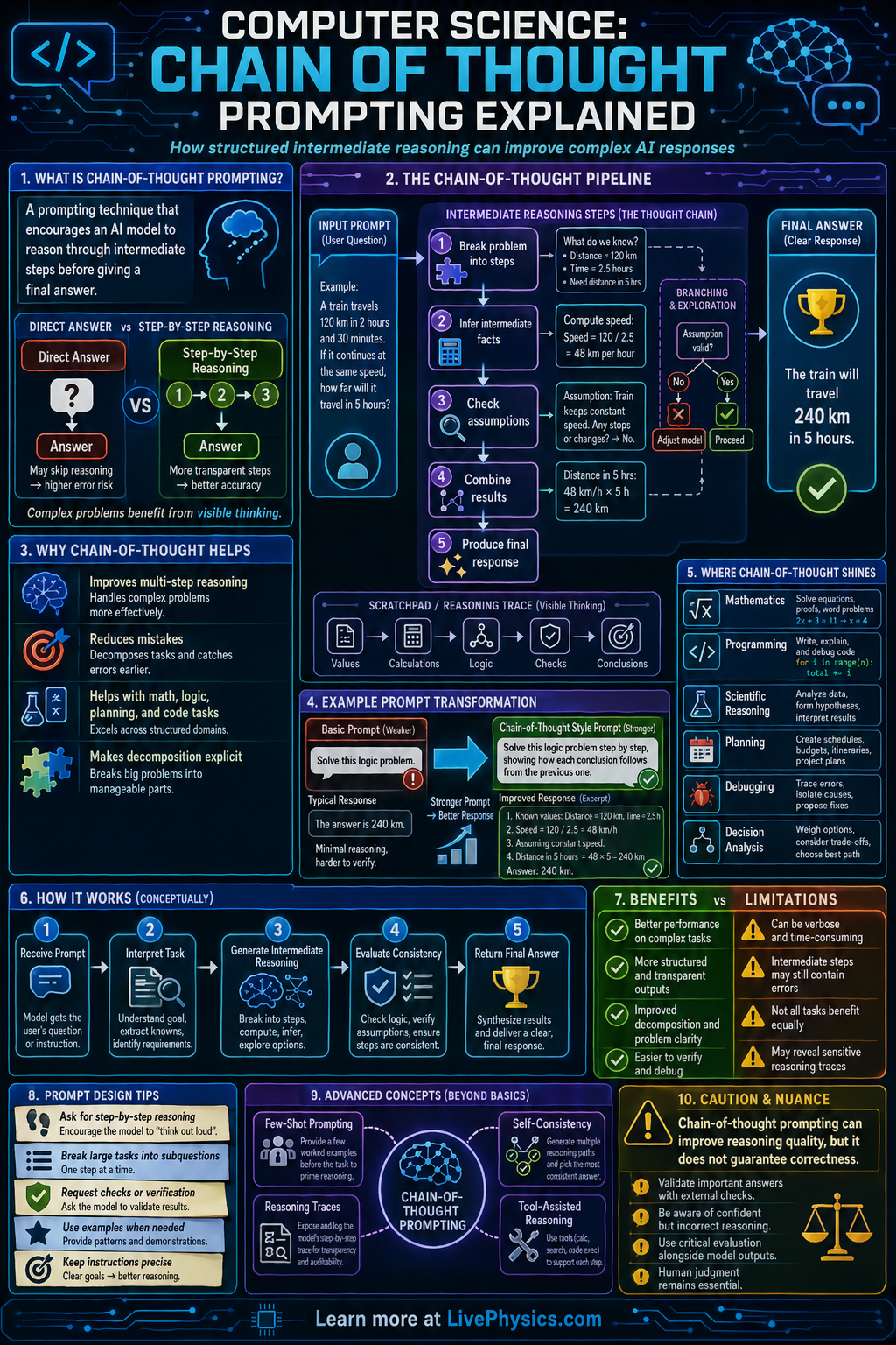 In practice, a prompt can encourage an AI to identify subproblems, evaluate options, and then produce a conclusion. This often improves performance on multi step tasks such as word problems, code tracing, and decision making, although it does not guarantee correctness. Researchers also study when to hide or summarize internal reasoning, since raw reasoning text may be unreliable, overly long, or unsafe to expose directly. A useful mental model is input -> structured reasoning process -> output, where the middle stage helps organize information and reduce careless errors.