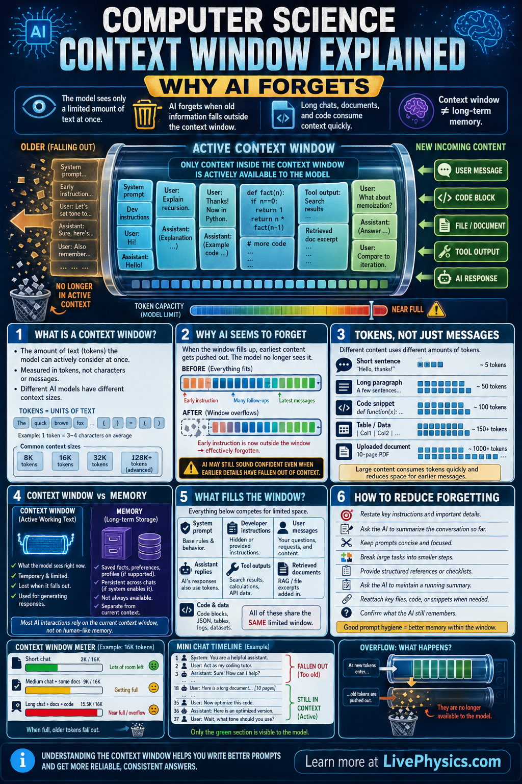 - If total tokens > context limit, older content must be dropped, truncated, or compressed.