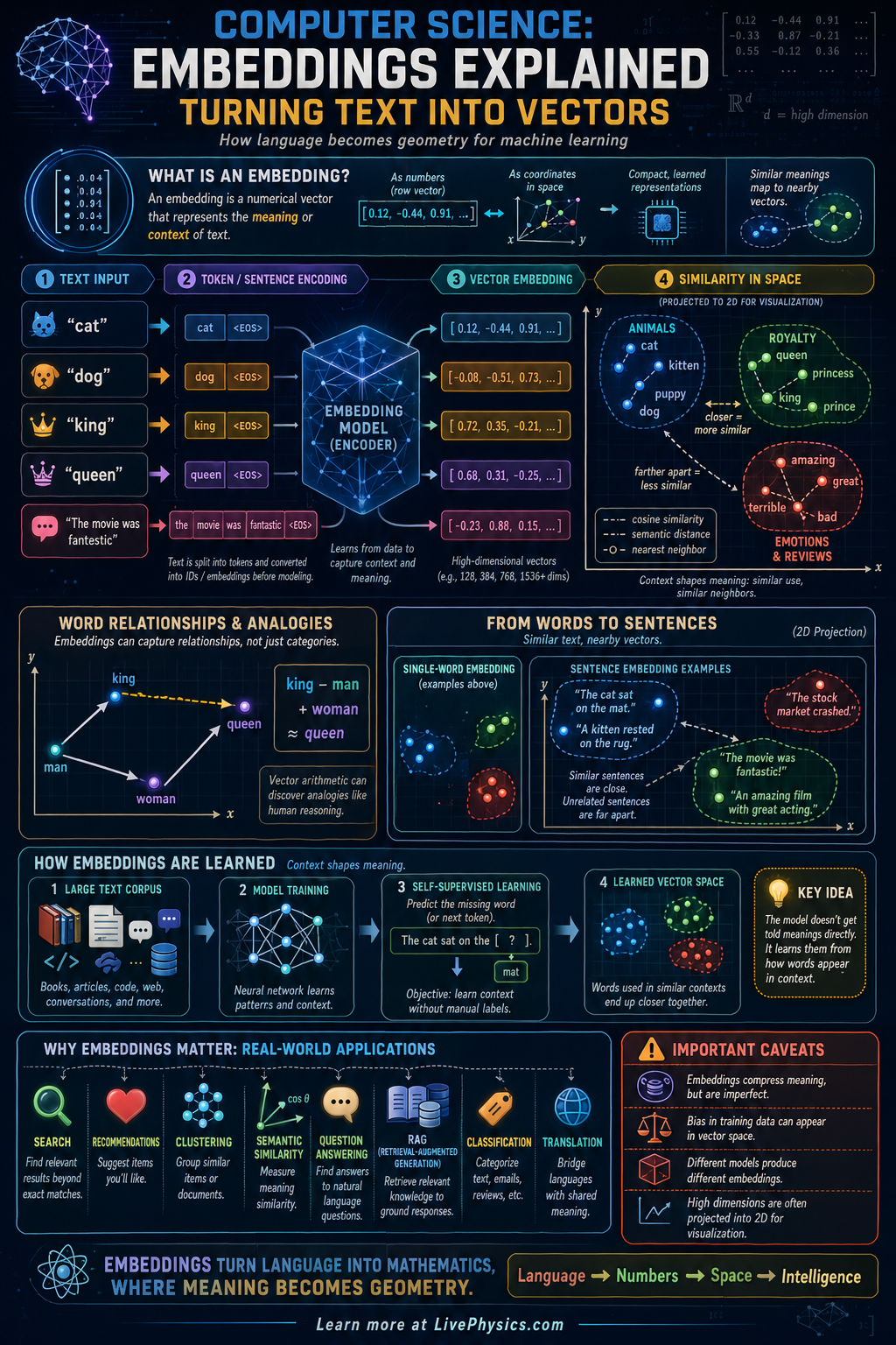 Embeddings are a way for computers to turn words, sentences, or other data into lists of numbers called vectors. These vectors let a machine compare meaning mathematically instead of treating text as isolated symbols. Embeddings matter because they power search, recommendation systems, translation, chatbots, and many other AI tools. They help computers notice that similar ideas should end up close together in a geometric space.