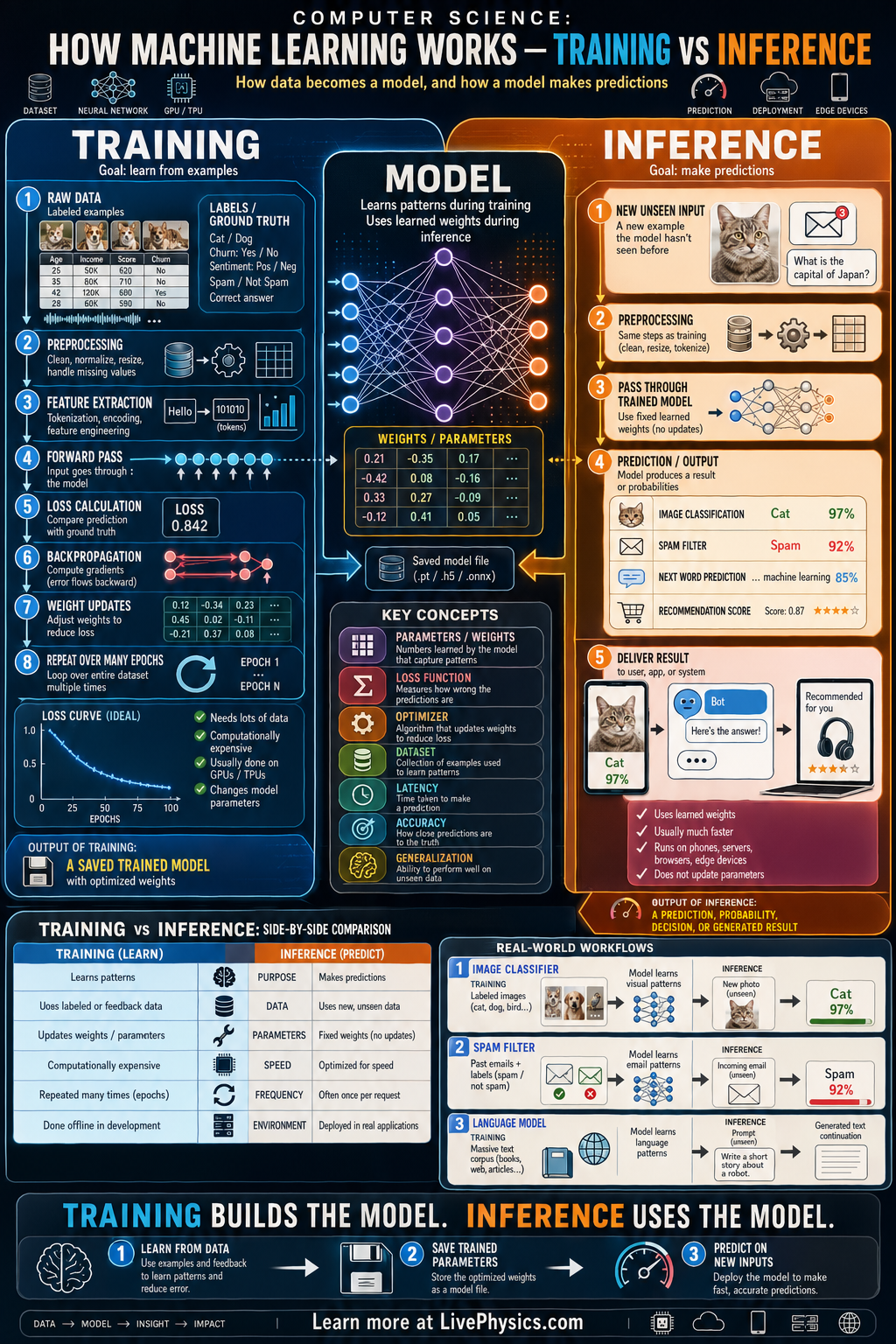 In training, examples with known answers are fed into the model, a loss is computed, and optimization updates the weights. This process may require many passes through large datasets and often uses powerful hardware such as GPUs. In inference, the weights are fixed, and the model performs a forward pass to produce an output such as a label, number, or generated text. Real applications depend on balancing training quality with inference speed, memory use, and reliability.