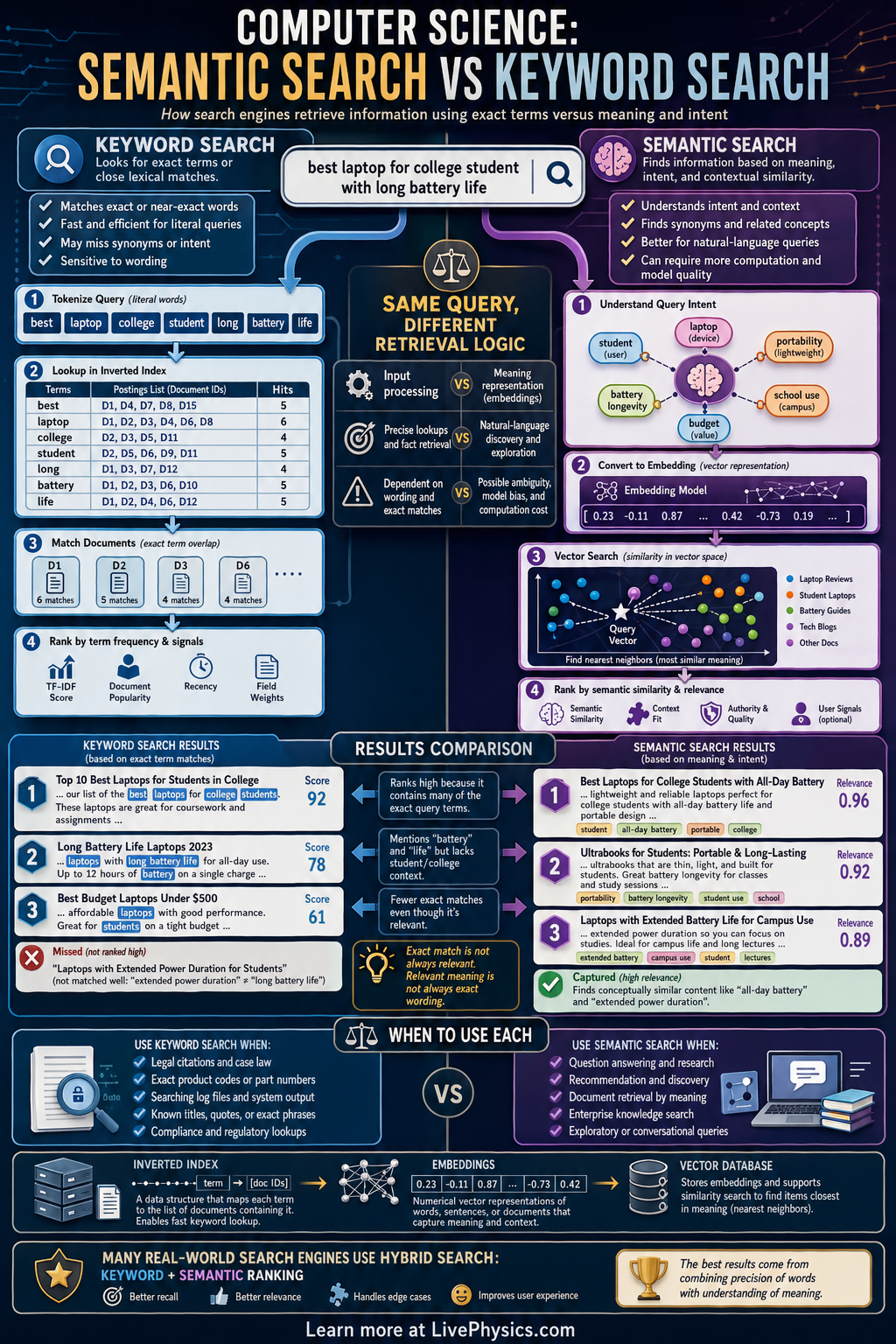 Keyword search is fast and effective when the query contains the exact terms stored in documents. Semantic search uses language models, embeddings, or knowledge graphs to compare ideas based on context and similarity rather than only word overlap. In practice, many modern systems combine both methods to improve relevance, speed, and accuracy. Understanding the strengths and limits of each approach helps students see how search engines, chatbots, and recommendation tools work.