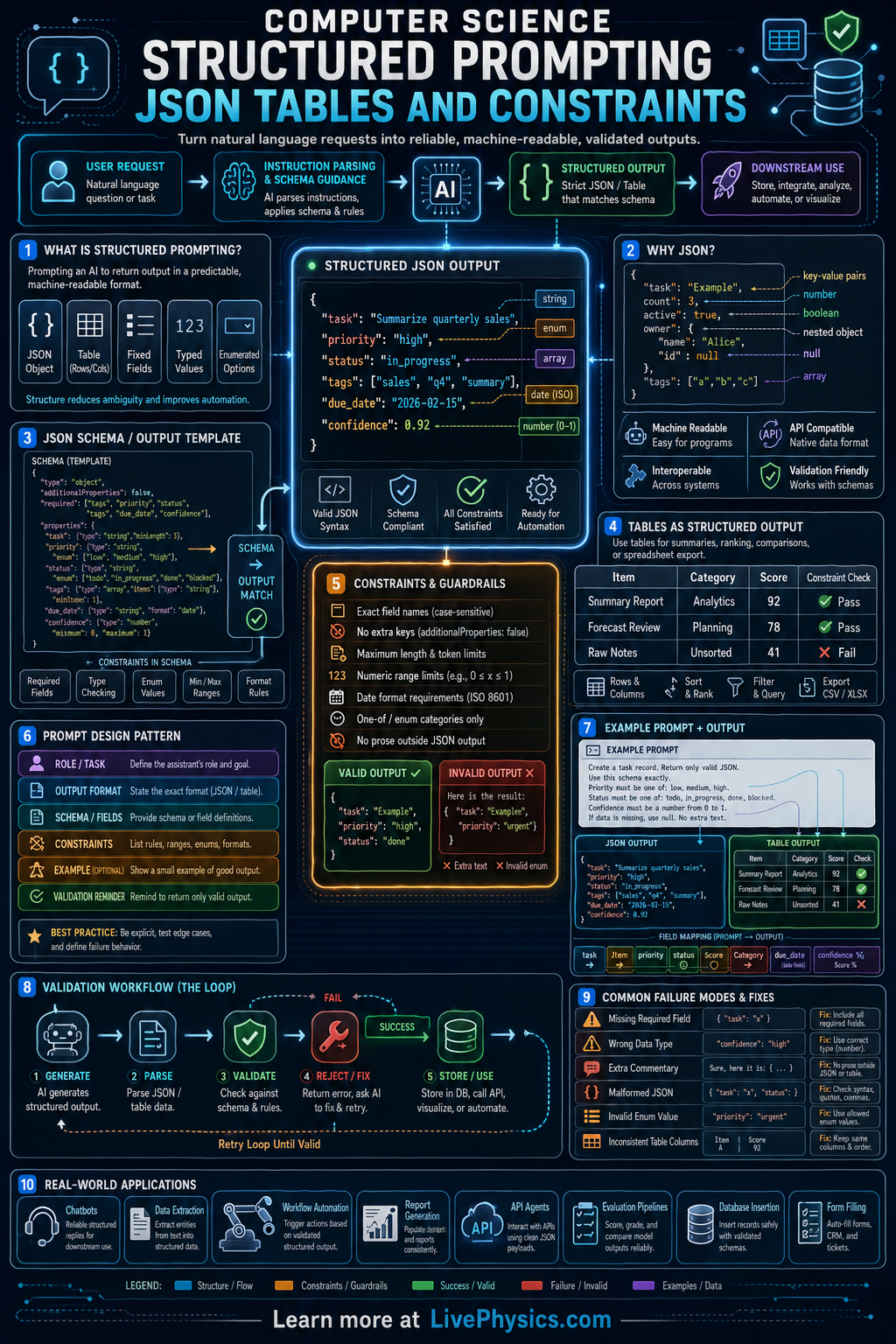 A structured prompt usually includes a task, an output schema, and rules that limit what the model is allowed to return. JSON is common because it represents nested data clearly with objects, arrays, strings, numbers, booleans, and null values. Tables are useful when each row follows the same columns, while constraints such as required fields, allowed values, and length limits improve consistency. Good structured prompting reduces ambiguity, lowers parsing errors, and makes AI responses more reliable for downstream systems.