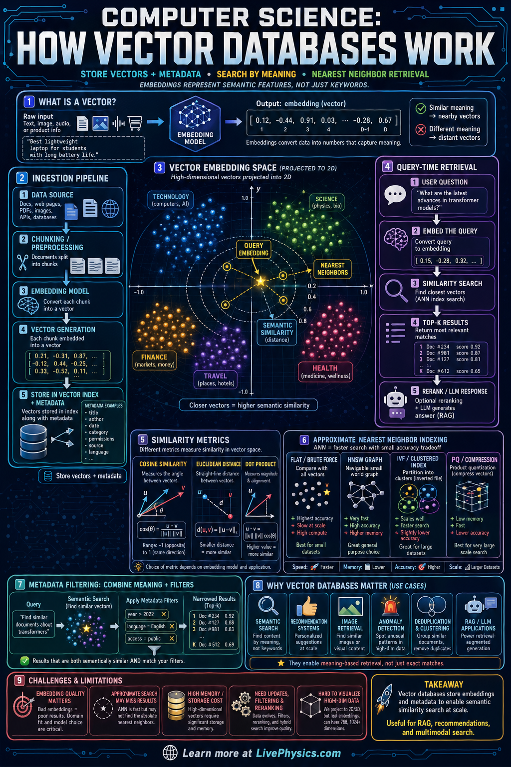 The basic workflow starts by converting each item into an embedding using a machine learning model. When a user submits a query, the system embeds the query too, then compares it to stored vectors using a similarity measure such as cosine similarity or Euclidean distance. Because checking every vector would be slow at large scale, vector databases use indexing methods like approximate nearest neighbor search to quickly find the closest matches. This supports applications such as retrieval-augmented generation, recommendation systems, image search, and anomaly detection.