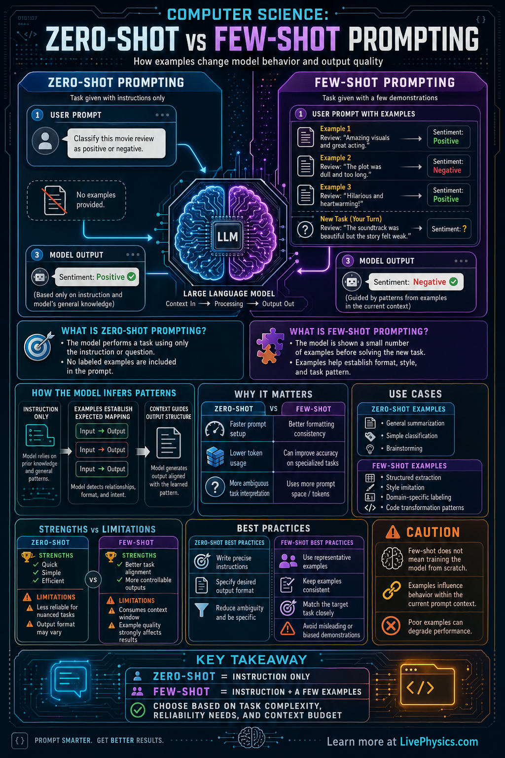 The difference comes from how the model uses context. A zero-shot prompt relies on the model's general training to infer what you mean from the instruction alone. A few-shot prompt adds short demonstrations, which help the model identify the desired structure or reasoning style. In practice, few-shot prompting often improves performance on specialized, ambiguous, or formatting-sensitive tasks, but it also uses more context space and can introduce bias from the chosen examples.