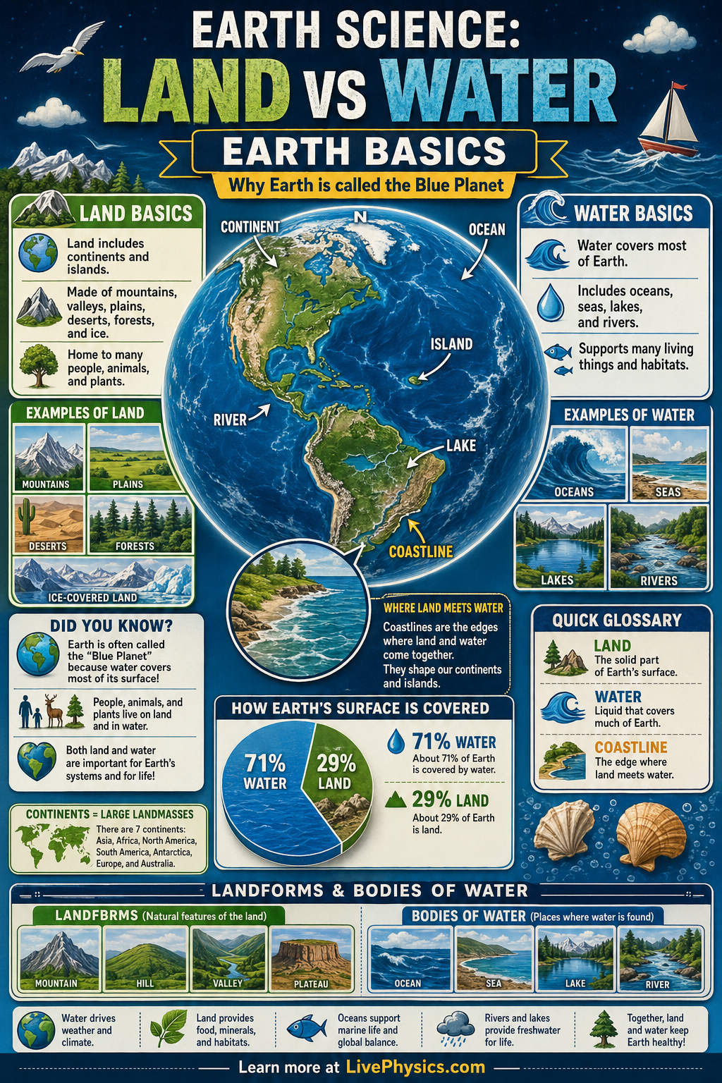 Earth is often called the blue planet because most of its surface is covered by water. About 71% of Earth's surface is water, while about 29% is land. This simple comparison helps explain why oceans play such a big role in climate, weather, and life on Earth. Understanding the balance between land and water is one of the first big ideas in Earth science.