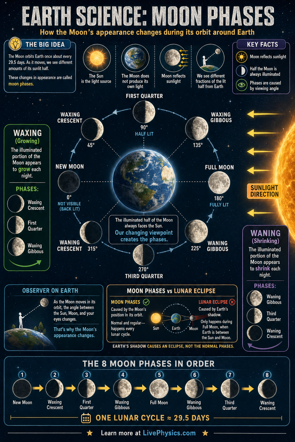 Moon phases are the changing shapes of the Moon's sunlit half as seen from Earth. They matter because they help explain the motion of the Earth Moon Sun system and connect directly to tides, calendars, eclipses, and night sky observation. The Moon does not make its own light, so every phase depends on reflected sunlight. As the Moon moves around Earth, we see different fractions of its illuminated side.