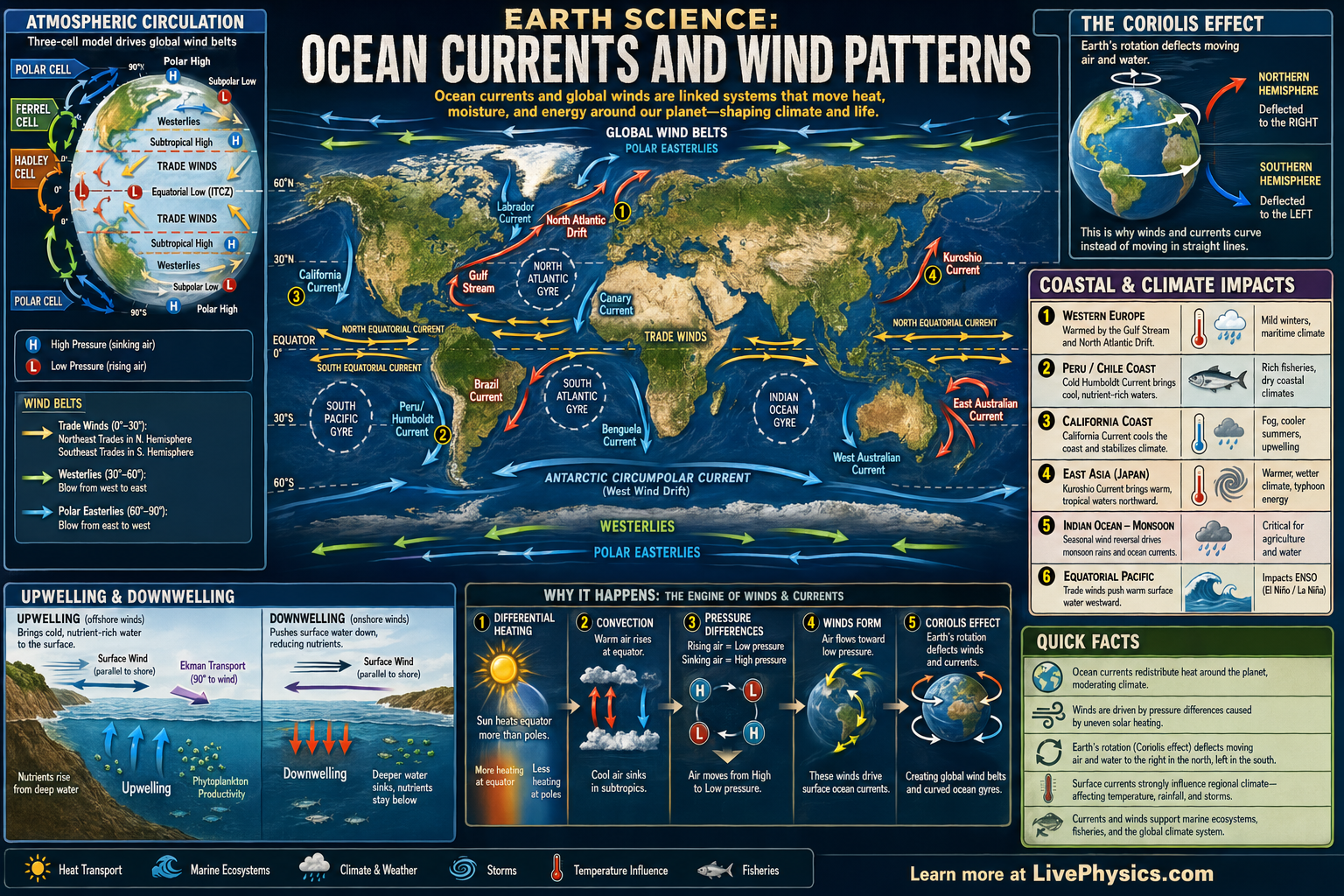 Ocean currents and global wind patterns move huge amounts of water, heat, and moisture around Earth. They help control climate, shape weather, and influence marine ecosystems and human activities such as shipping and fishing. Warm currents can raise temperatures along nearby coasts, while cold currents often cool coastal regions and affect rainfall. Understanding these patterns helps explain why different parts of the world have very different climates.