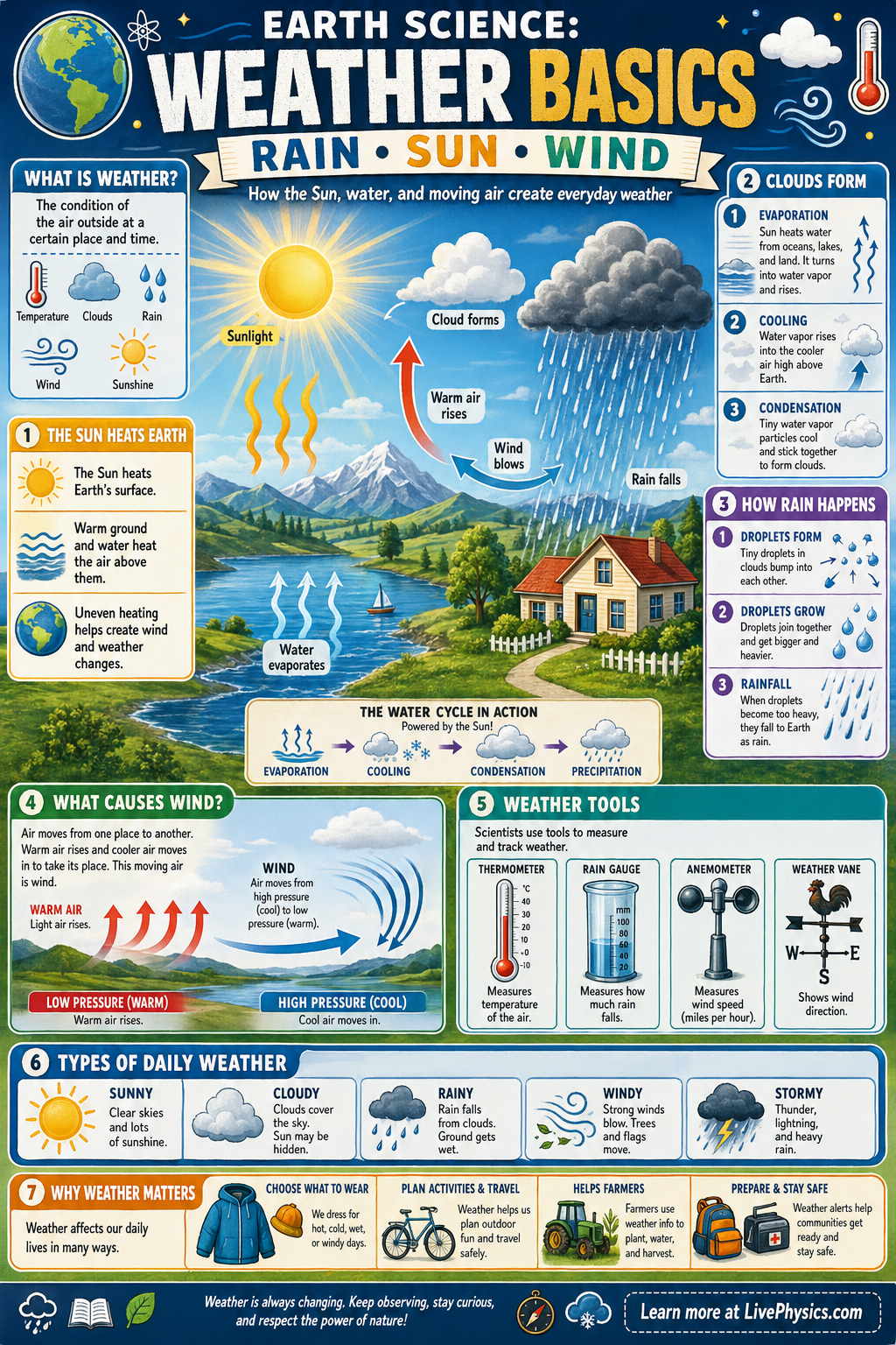 Sunlight warms land and water, but land usually heats and cools faster than water. Warm air becomes less dense and rises, while cooler air sinks and moves in to replace it, creating wind. Water evaporates, rises, cools, and condenses into clouds, and when droplets grow large enough they fall as rain. These connected processes explain many common weather patterns students observe every day.