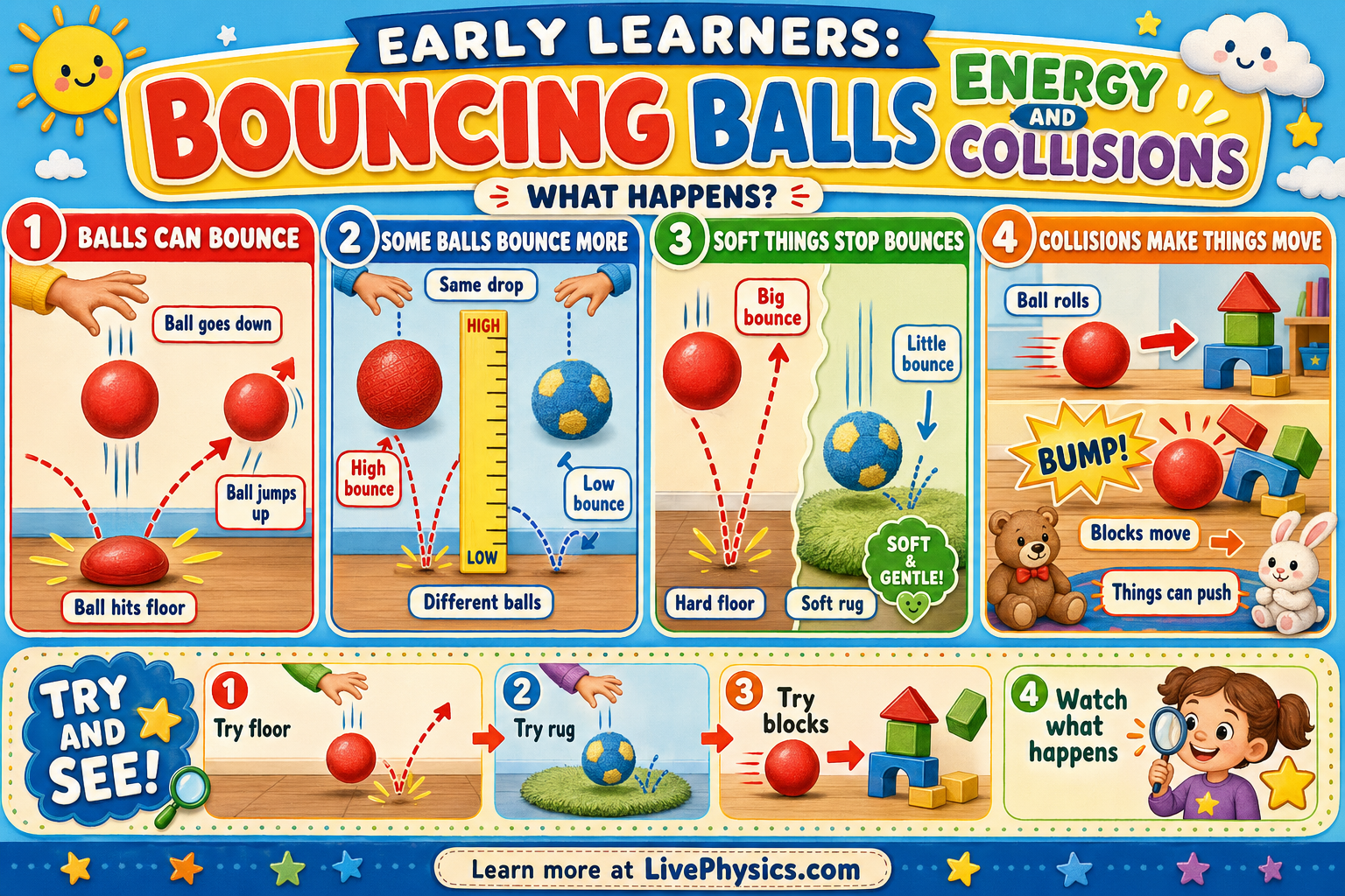When a ball hits the floor, it pushes on the floor and the floor pushes back on the ball. Some balls bounce high because they keep more of their motion, while others lose more energy to sound, heat, or squishing. Soft rugs, grass, and pillows usually make balls bounce less than hard floors or sidewalks. Collisions also show that when objects touch, they can change speed, direction, or stop.