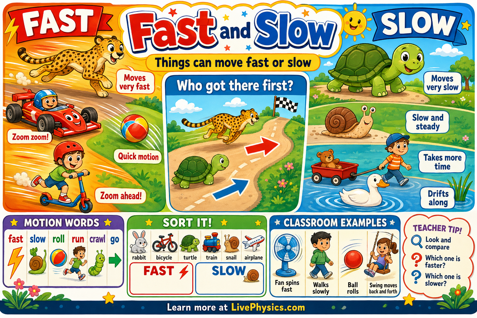 Speed and motion help children describe how things move in the world around them. A toy car can go fast, a turtle can go slow, and a ball can roll, bounce, or stop. Learning these ideas builds observation skills and helps students compare objects in simple, meaningful ways. It also connects science to play, sports, and everyday classroom activities.