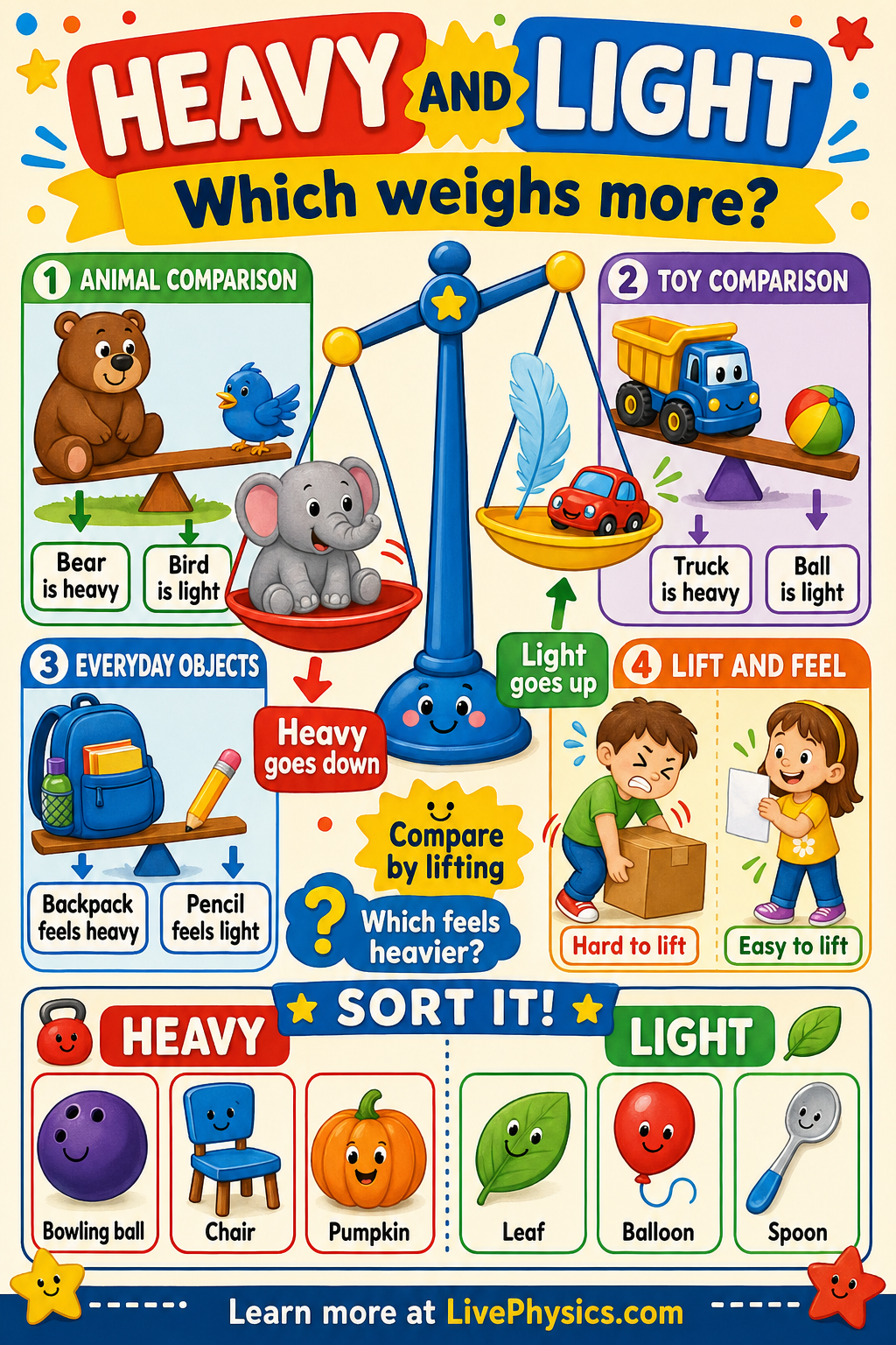 Weight tells us how heavy or light something is. Young learners compare objects by lifting them, holding them, or looking at a balance scale. This helps children describe the world with words like heavy, light, heavier, and lighter. It also builds early math and science skills through sorting and comparing.