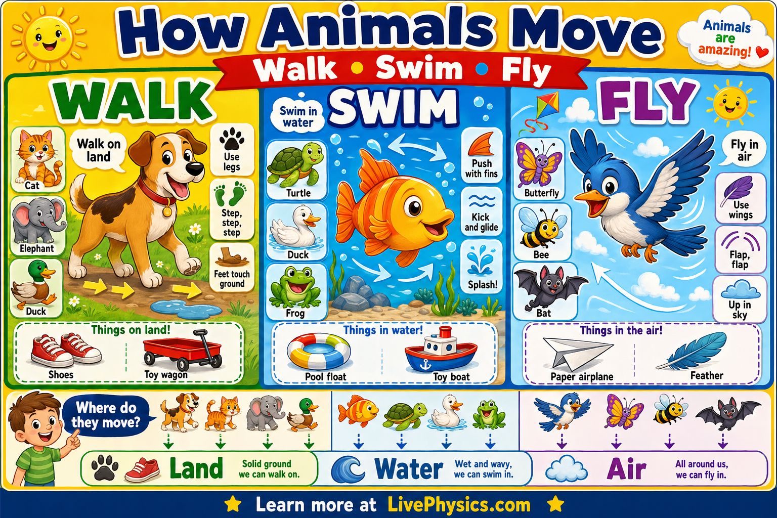 Animals move in different ways to help them find food, stay safe, and get where they need to go. Some animals walk on land, some swim in water, and some fly in the air. Learning about movement helps children notice how body parts match what an animal does. It also builds observation skills they can use in science and everyday life.