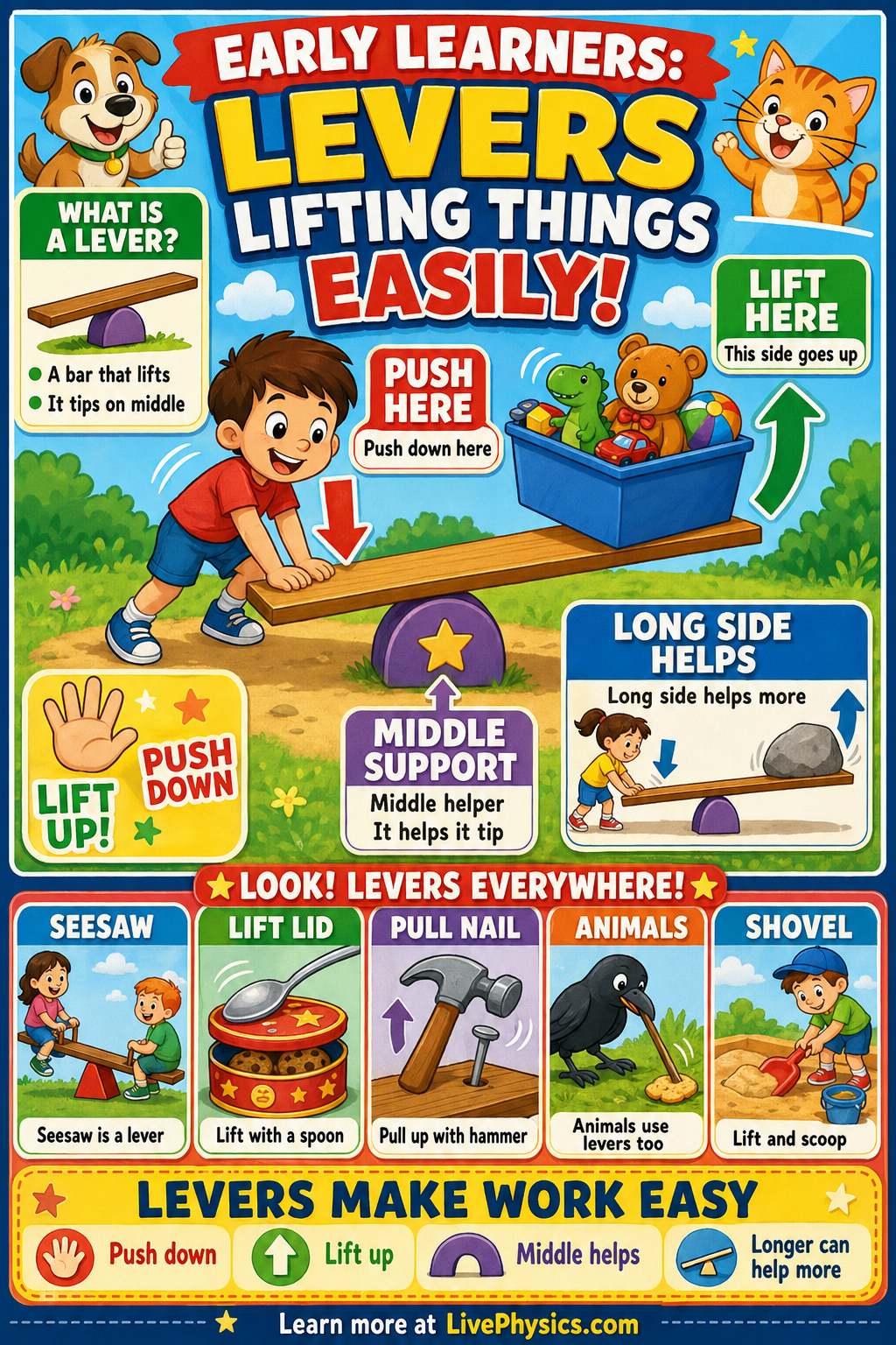 A lever is a simple tool that helps lift or move things more easily. Young children see levers in everyday life, like on a seesaw, a shovel, or a bottle opener. Learning about levers helps students notice how pushing in one place can make something move somewhere else. It builds early science thinking by connecting play, tools, and motion.