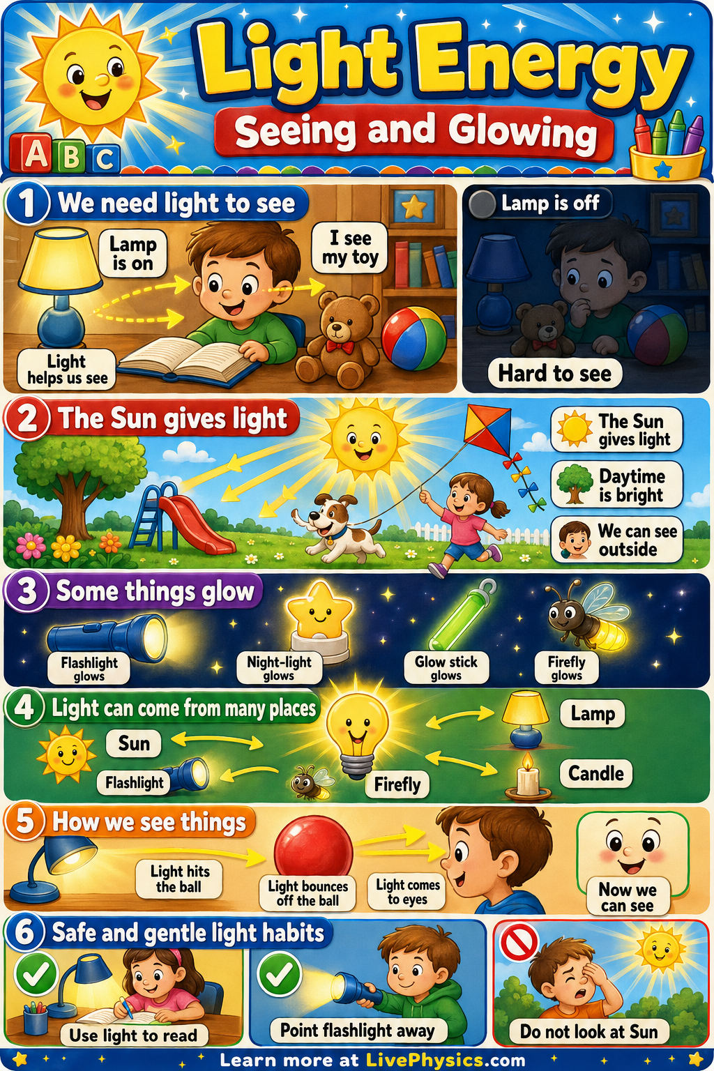 Our eyes need light to see objects clearly. The Sun, lamps, and flashlights are light sources because they glow by themselves. A ball, a chair, or a cat can be seen when light bounces off them and into our eyes. This idea connects to shadows, shiny surfaces, and why dark rooms are hard to see in.