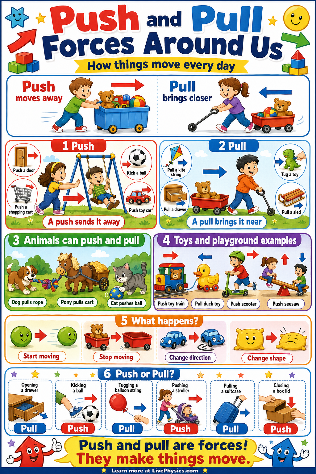 A push moves something away, and a pull brings something closer. Some objects move easily, while others need a bigger push or pull. Toys, animals, and playground equipment are great examples because children already know them well. By comparing everyday actions, students can sort movements into simple force ideas they can remember.