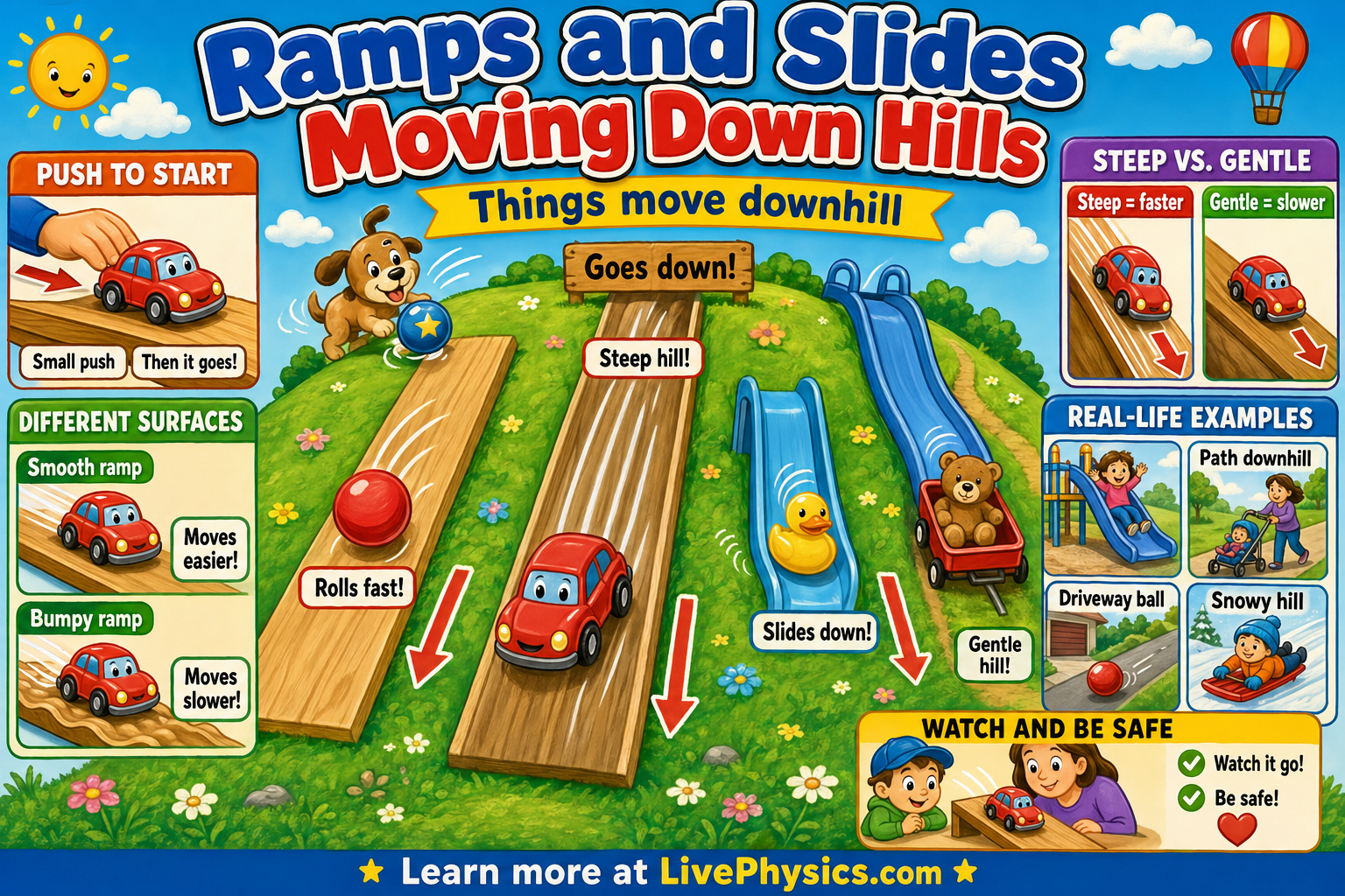 Ramps and slides help children see how things move down a hill. A toy car, a ball, or a wagon can roll or slide from high to low. This idea matters because it helps kids notice motion in playgrounds, roads, and everyday play. It also builds early science thinking by comparing what moves fast, slow, far, or near.