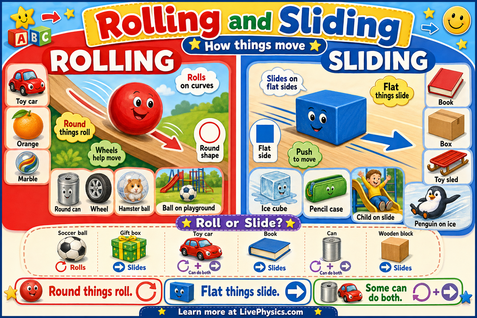 Rolling usually happens when an object has a round part, like a ball, wheel, or can. Sliding happens when an object moves across a surface without turning all the way around, like a book or a box. Children can compare toys and classroom objects to notice which ones roll, which ones slide, and which ones can do both. This helps them sort objects, make predictions, and explain their ideas using simple words.