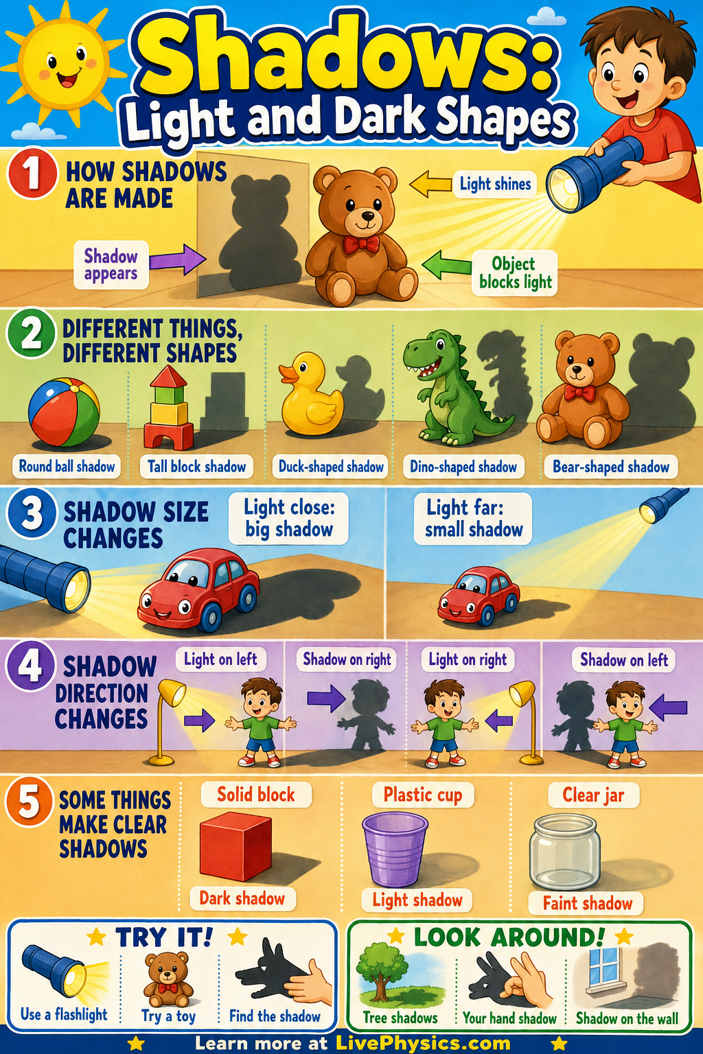 Shadows help young learners notice how light moves and how objects can block it. Children see shadows every day on playgrounds, walls, and floors, so this topic connects science to familiar experiences. Learning about light and dark shapes builds observation skills and simple cause and effect thinking. It also gives students fun ways to explore with flashlights, toys, and their own hands.