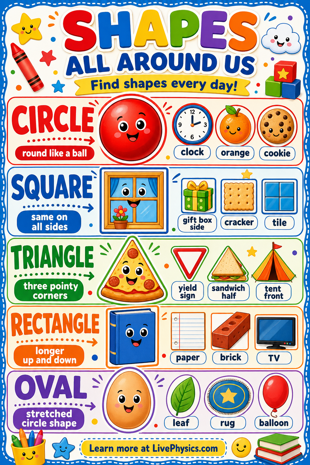 Shapes are all around us in the things children see and use every day. A ball looks like a circle, a window can look like a square, and a slice of pizza can look like a triangle. Learning shapes helps children notice patterns, describe objects, and talk about the world more clearly.