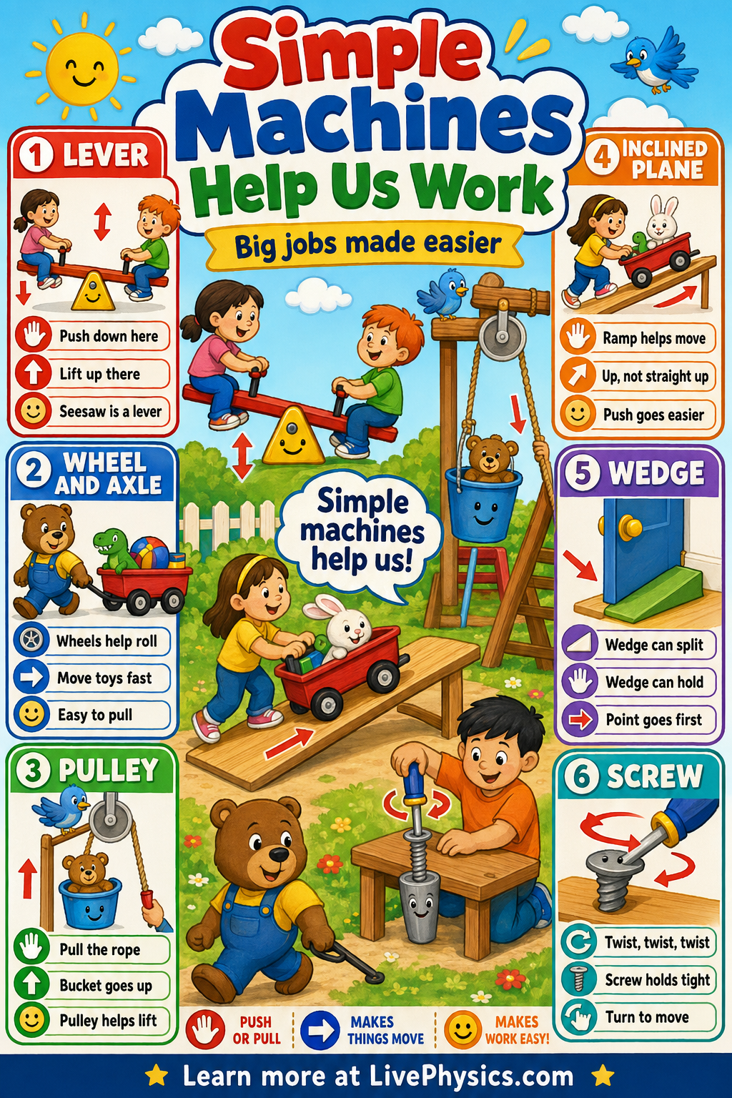 Simple machines are tools that help us do work more easily. Young learners see them every day on playgrounds, in classrooms, and at home. A ramp helps move things up, and a seesaw helps lift one side with less effort. Learning these tools helps children notice how the world around them works.