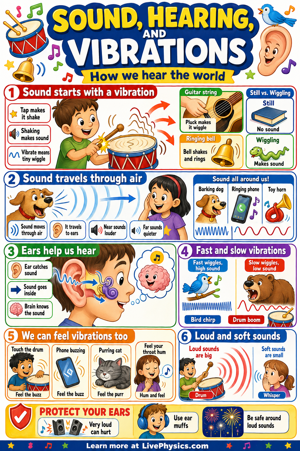 Vibrations can travel through air, water, and solids like tables or walls. When an object vibrates, it makes the nearby material vibrate too, and the sound moves along. Bigger vibrations often make louder sounds, while faster vibrations can make higher sounds. Learning about sound helps children connect what they hear to how the world moves.