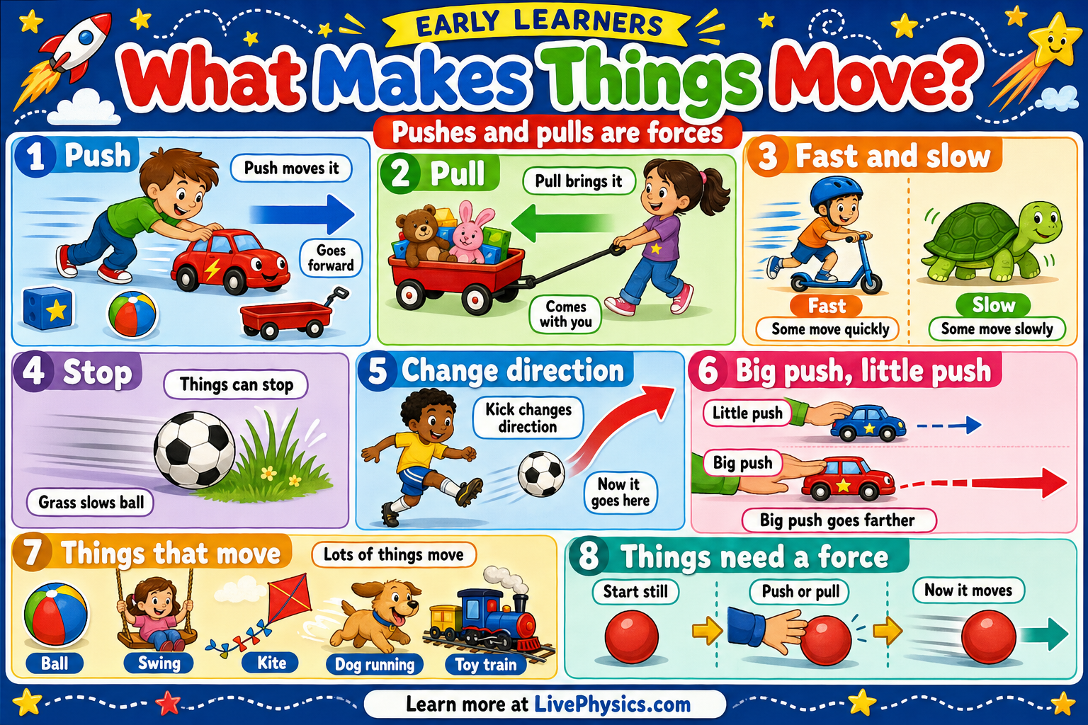 Forces are pushes and pulls that make things start moving, stop moving, speed up, slow down, or change direction. Young children see forces every day when they kick a ball, pull a wagon, or slide a toy car across the floor. Learning about motion helps them describe what objects do and why they do it. It also builds early science skills by connecting play to simple cause and effect.