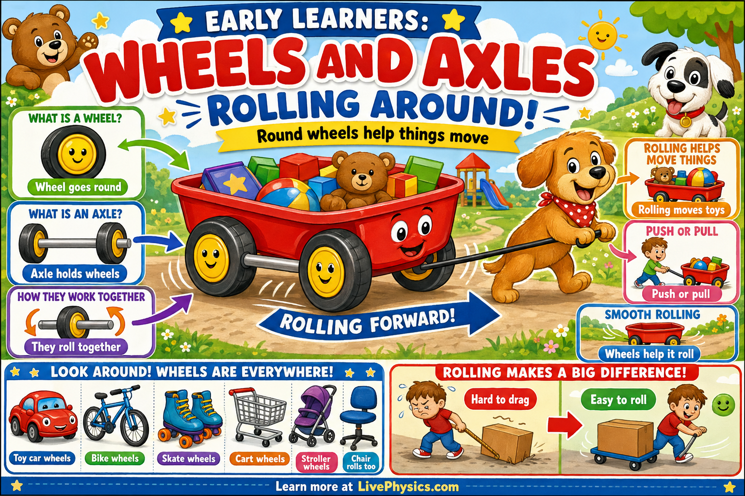 Wheels and axles help things roll and move more easily. Young children see them every day on bikes, toy cars, wagons, and buses. Learning about them helps kids notice how simple parts work together. It also builds early science thinking by connecting play to real objects.