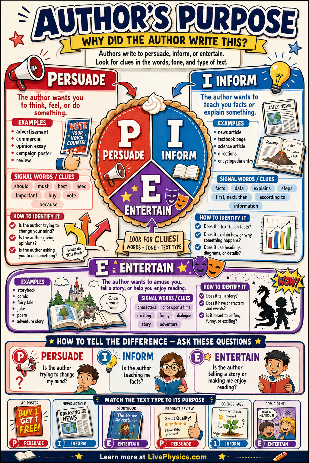 Authors write for different reasons, and understanding those reasons helps students become stronger readers. One common way to remember the main purposes is the PIE framework: Persuade, Inform, and Entertain. When readers know an author's purpose, they can better understand the message, tone, and type of text they are reading. This skill is useful for schoolwork, media literacy, and everyday reading.