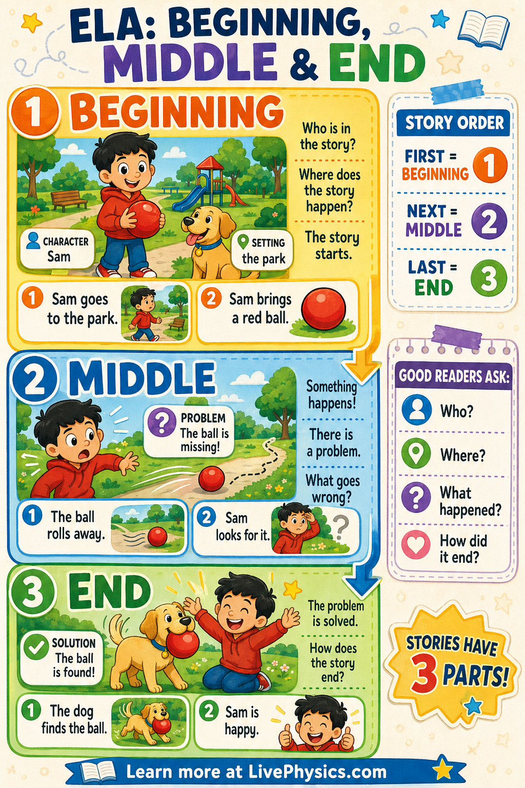In the beginning, readers meet the characters and learn where the story happens. In the middle, a problem or important event makes the story more exciting and moves the action forward. In the end, the problem is solved or the story wraps up in a clear way. This three-part structure is a strong tool for reading comprehension and early writing.