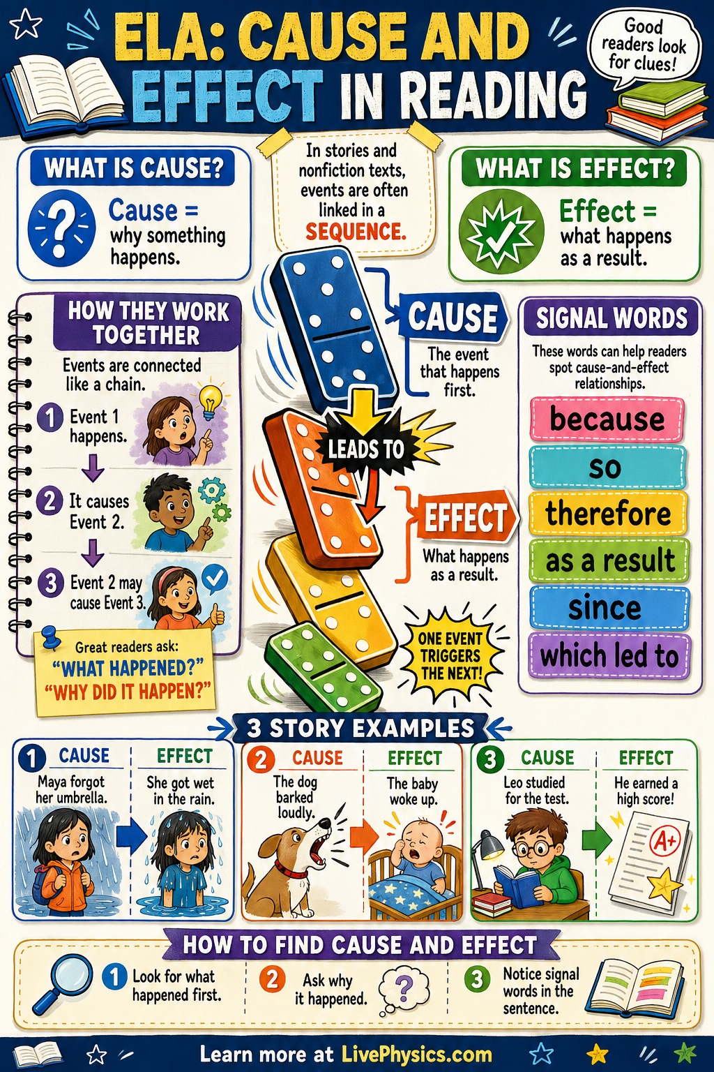 Cause and effect helps readers understand how events are connected in a story or an informational text. A cause is why something happens, and an effect is what happens because of that cause. When students notice these links, they can follow the text more clearly and understand characters, problems, and outcomes. This skill also helps with summarizing, predicting, and answering reading questions.