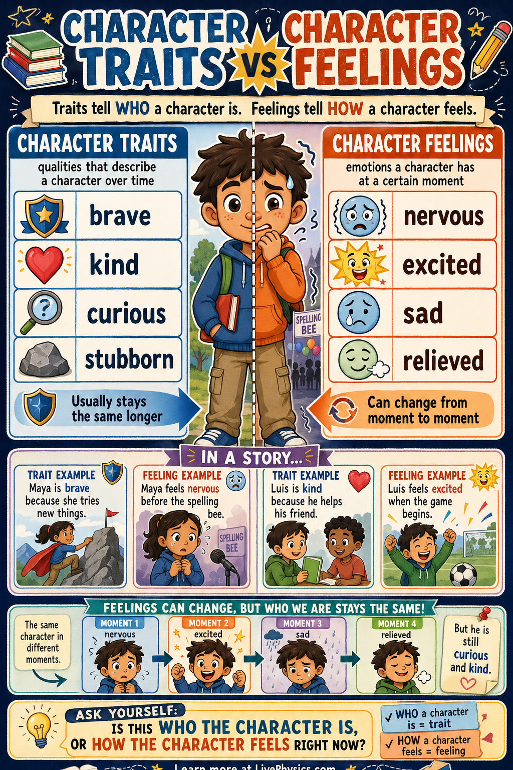 When readers learn about characters, they need to notice both character traits and character feelings. Character traits tell who a character is on the inside, such as being kind, brave, or curious. These traits usually stay fairly steady across much of the story. Character feelings tell how a character feels at a certain moment, such as happy, nervous, or frustrated.