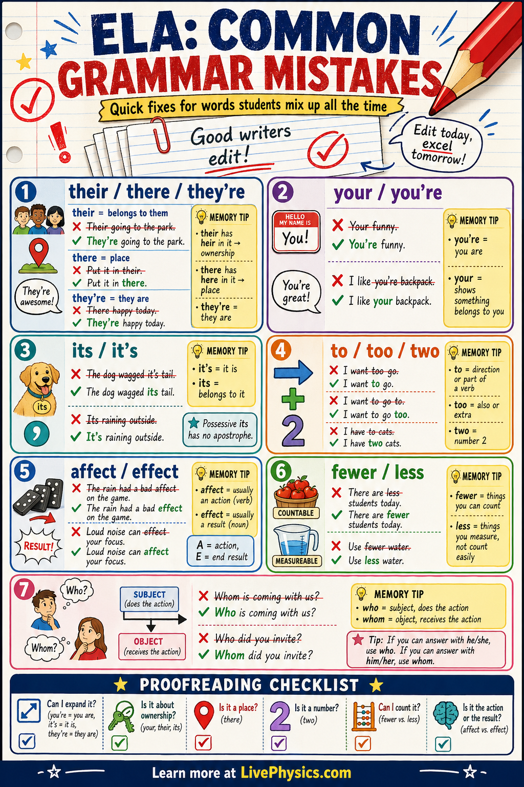 Grammar mistakes are common because many English words sound alike or look similar even though they have different meanings. Learning to spot these errors helps students write more clearly and speak more confidently. Strong grammar also makes school assignments, emails, and essays easier for other people to understand. A good correction guide gives students quick ways to remember the right choice.