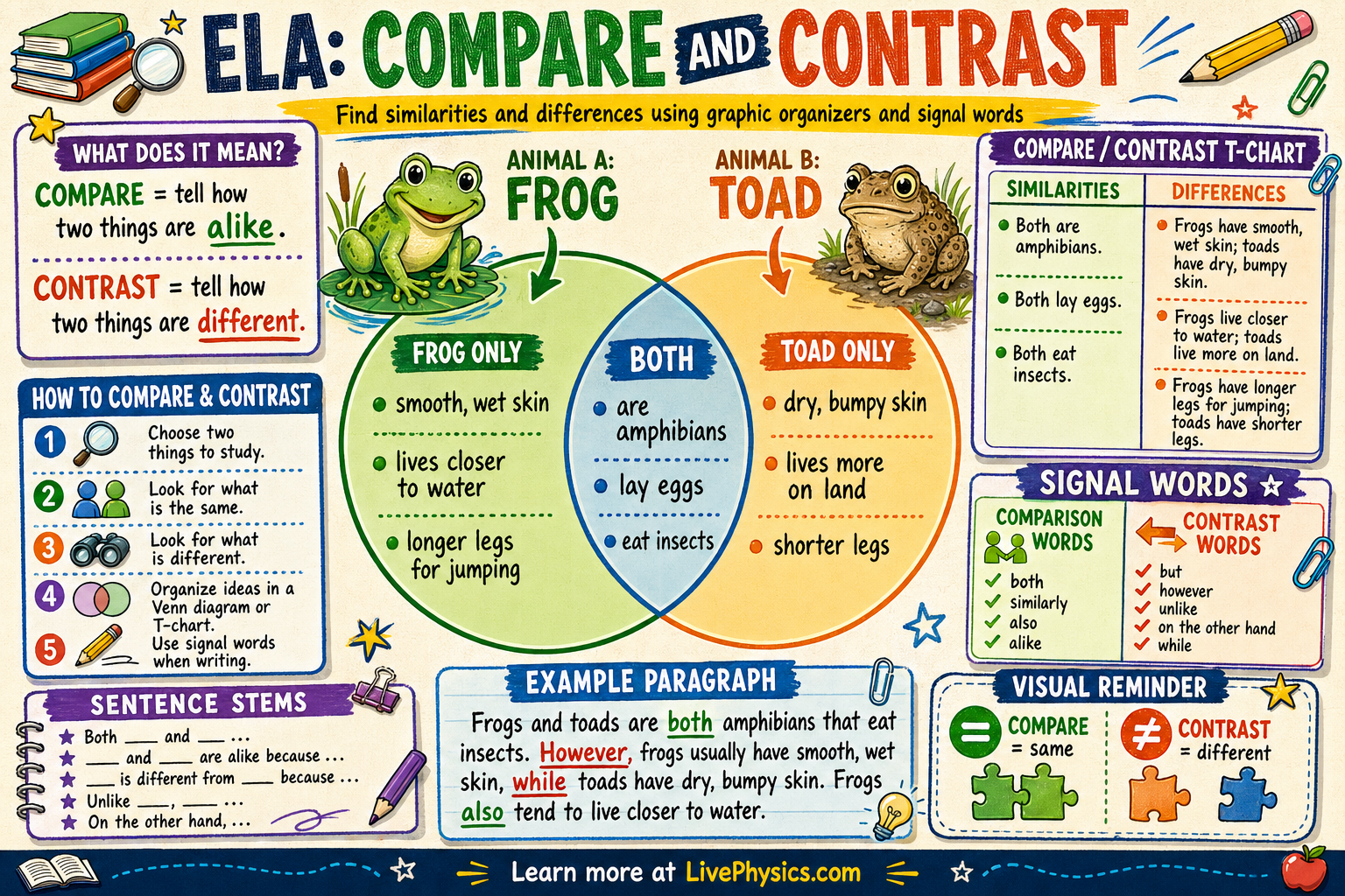 Compare and contrast is a reading and writing skill that helps students notice how two things are alike and different. It is useful when reading stories, nonfiction, and even science or social studies texts. This skill helps readers organize ideas clearly and understand details better. It also helps writers explain their thinking in a way that is easy to follow.