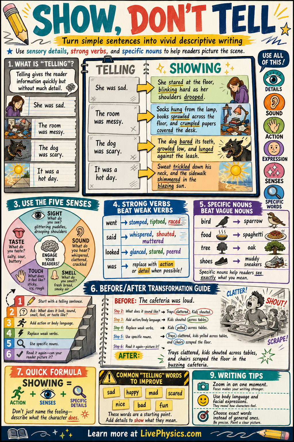 Descriptive writing becomes stronger when readers can picture, hear, feel, smell, or taste what is happening. Instead of simply telling an emotion or action, good writers show it through details. This helps the reader build a clear image and feel more connected to the scene. Learning to show, not tell makes stories, essays, and personal narratives more vivid and memorable.